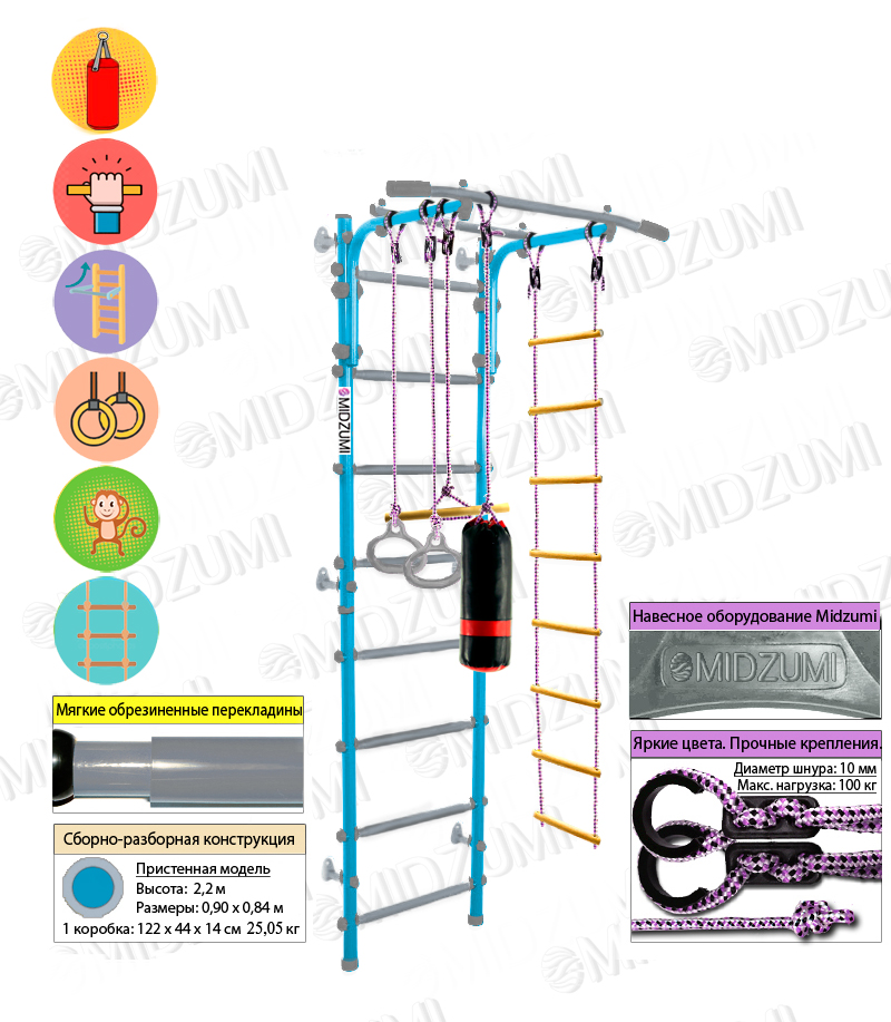 Для маленьких непосед, чья мечта стать профессиональным боксером Торговый Дом Midzumi разработал комплекс Banji Kabe Boxing, который поможет ребенку сделать первые шаги в этом виде спорта. Использование боксерского мешка подарит отличное настроение и восторг пользователям любого возраста. Комплекс для иных спортсменов дополнительно оснащен гимнастическими кольцами, тарзанкой и веревочной лестницей.