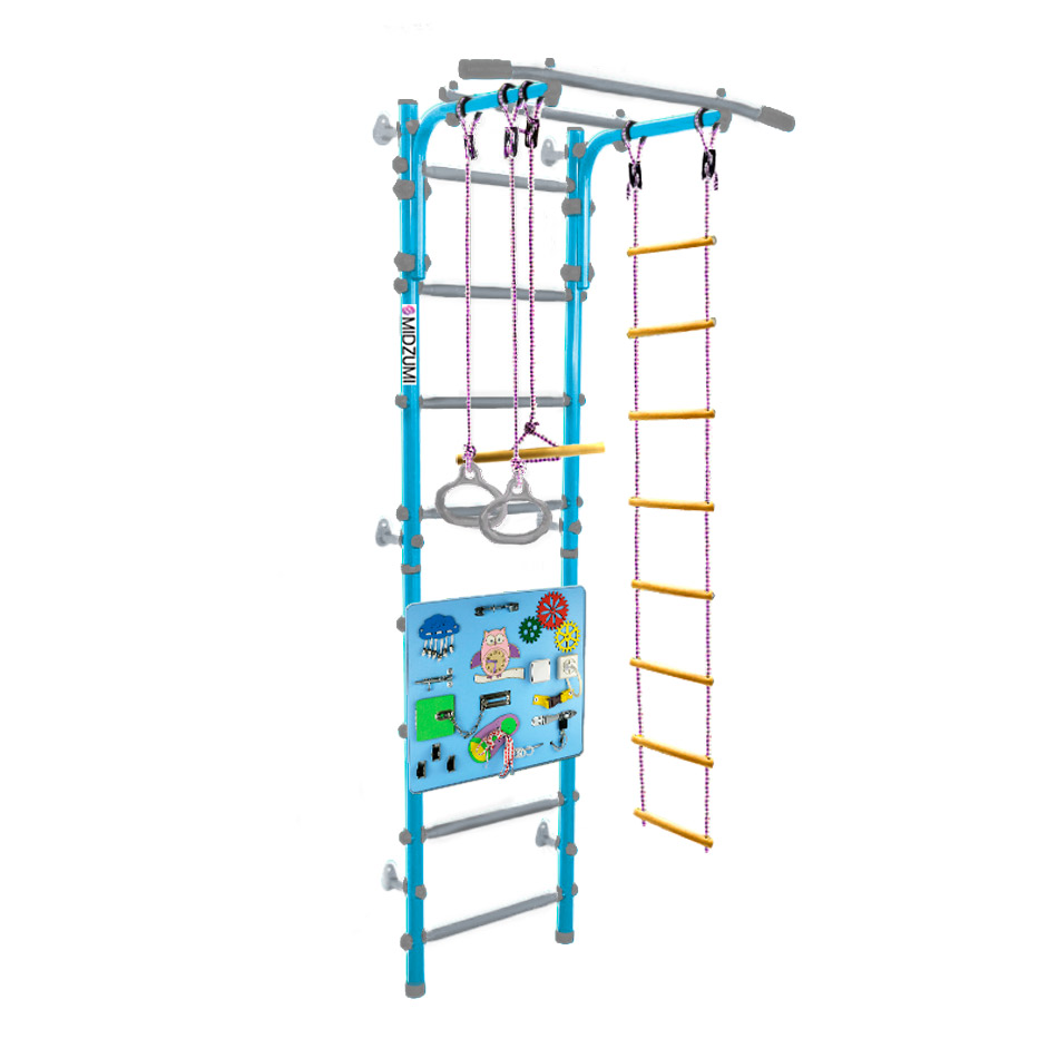 Комплектация: основа - металлическая шведская стенка с турником, гимнастические кольца, тарзанка, веревочная лестница, бизиборд