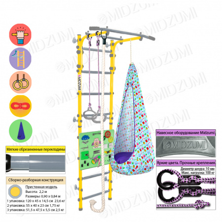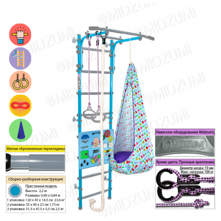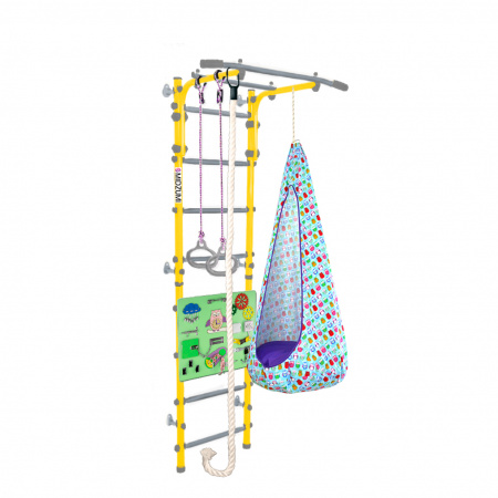 Комплектация: основа - металлическая шведская стенка с турником, гимнастические кольца, канат, качели-кокон, бизиборд.