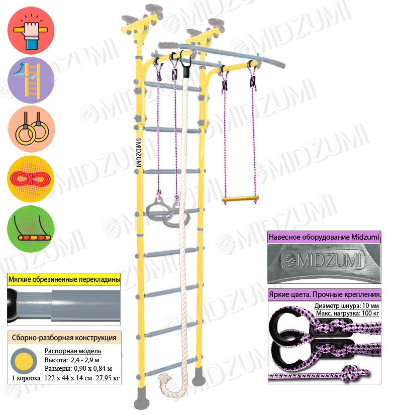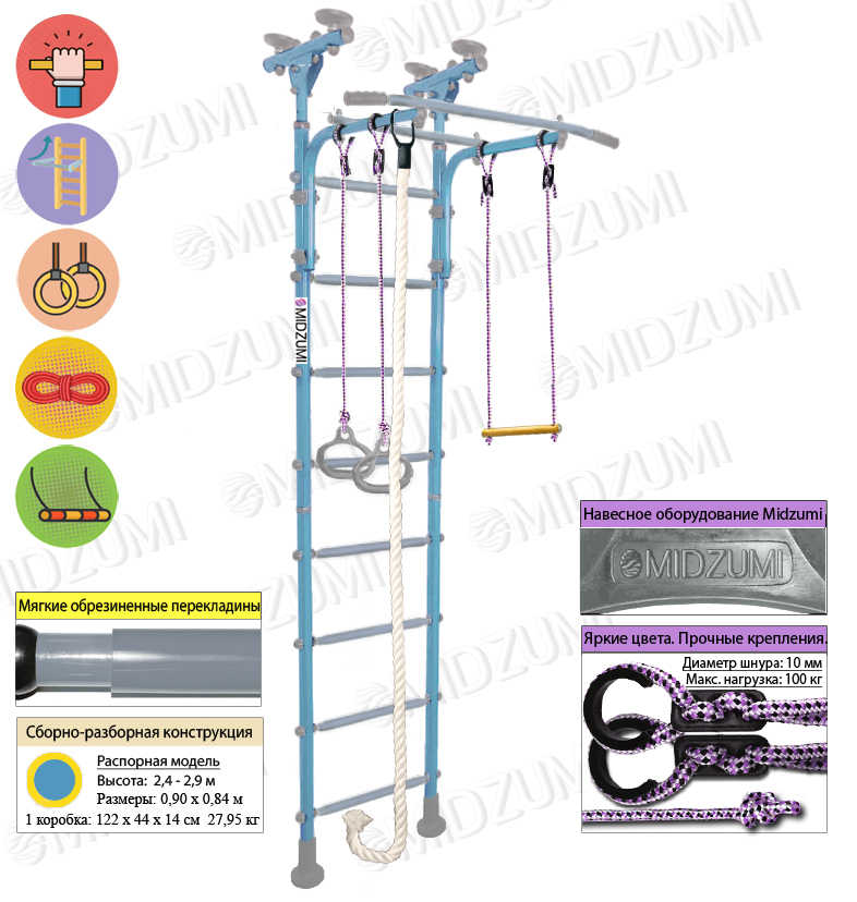 Ваш ребенок готов к приключениям? В таком случае, время организовать спортивный уголок у себя дома. Midzumi Hoshi идеально подходит для юных непосед. Домашний комплекс можно считать прямой и долговременной инвестицией в здоровье детей, потому как уровень физического развития принято считать достоверным признаком их здоровья. Польза от такого комплекса не только для детей, но и для других членов семьи, так как турник могут освоить и родители.