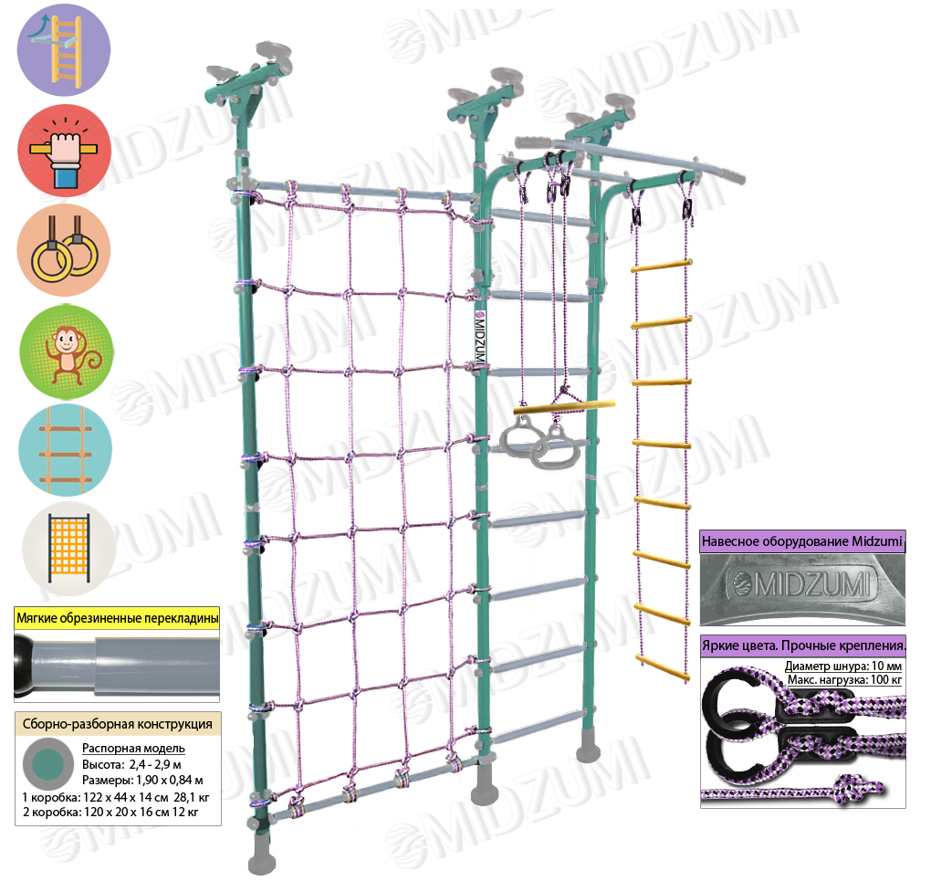 Комплектация: основа - металлическая шведская стенка с турником, гимнастические кольца, тарзанка, веревочная лестница, канатный лаз