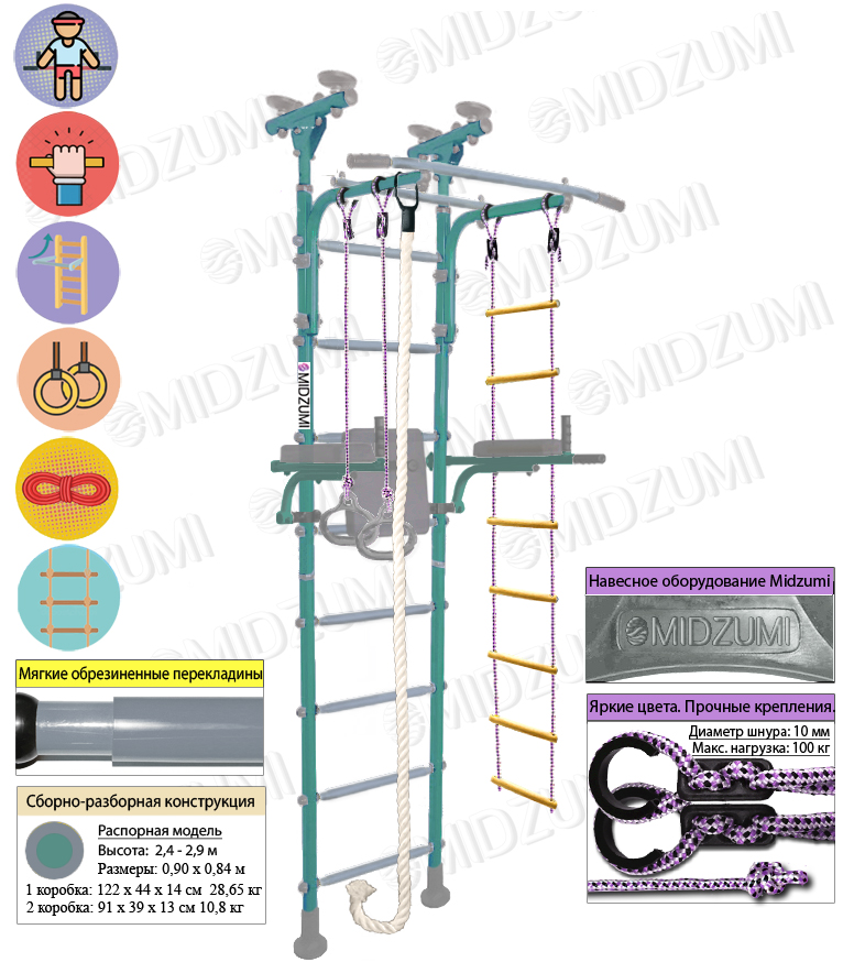 Комплектация: основа - металлическая шведская стенка с турником, гимнастические кольца, канат, веревочная лестница, брусья откидные.