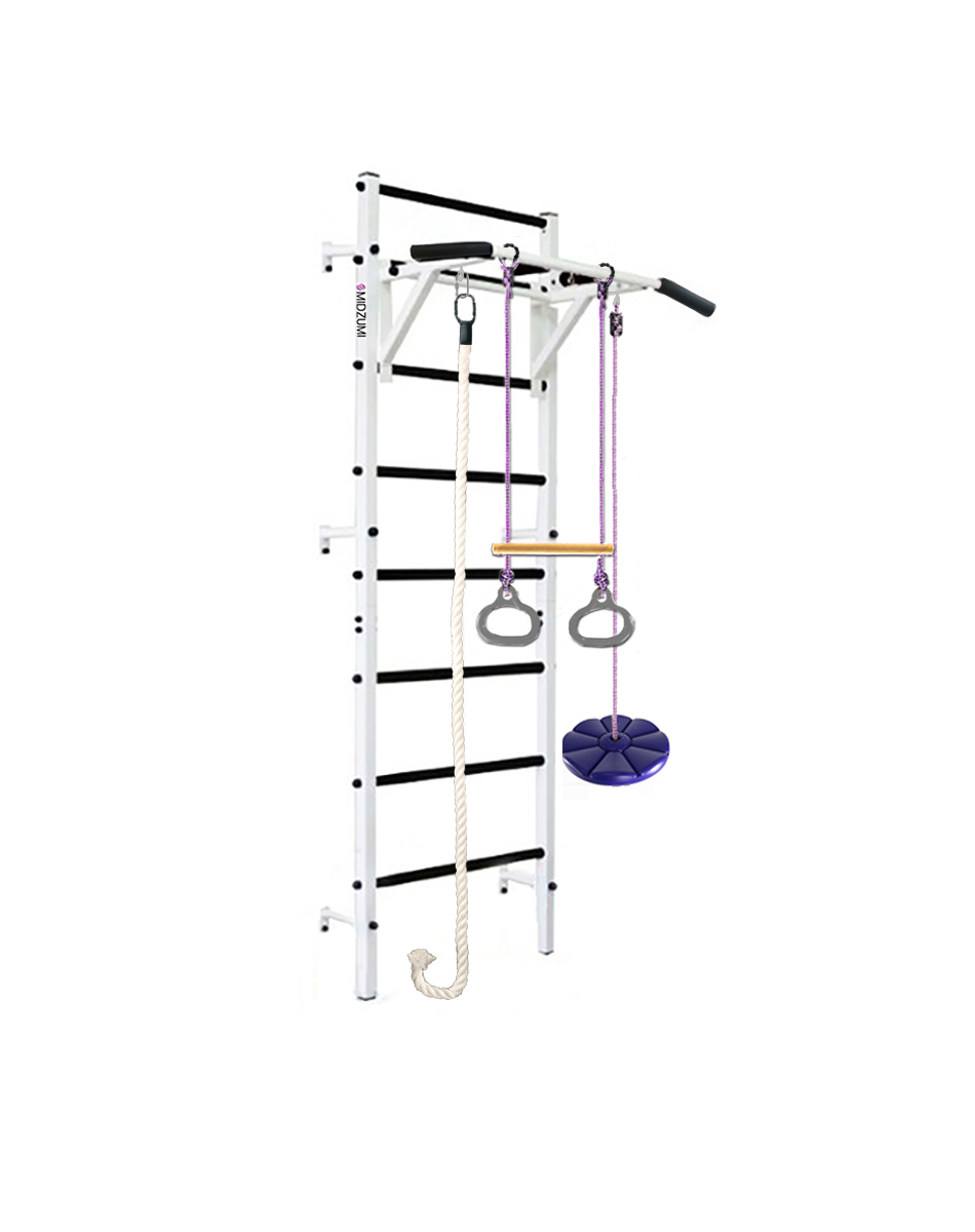 Функциональный комплекс для всей семьи! Нейтральный белый цвет придется по вкусу и мужчинам, и женщинам, и детям. Предусмотрены дополнительные крепления для аксессуаров и снарядов (боксерская груша, TRX и пр.). Турник передвижной, устанавливается под размер пользователя. Прорезиненные ступени и хваты предотвратят скольжение и создадут приятные ощущения во время тренировок. Прочная металлическая конструкция позволяет выдерживать нагрузку до 250 кг. Рассчитан в первую очень на занятия взрослому, но возможно заниматься и ребенку.