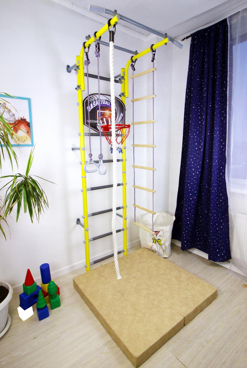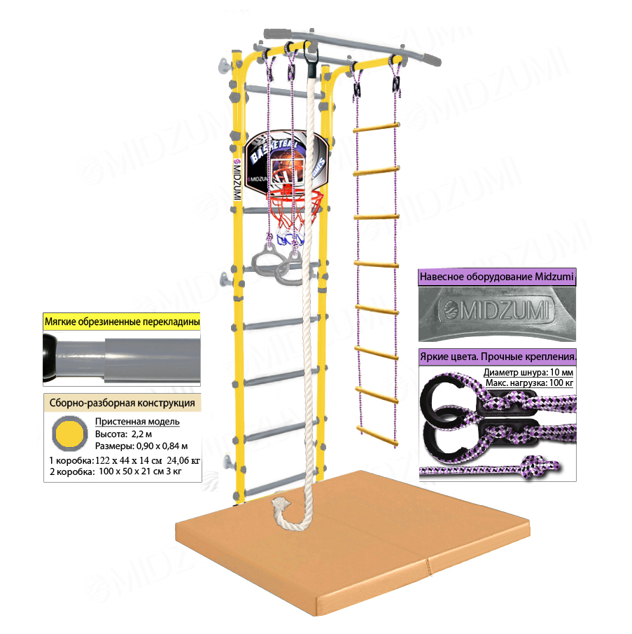 Комплектация: основа - металлическая шведская стенка с турником, гимнастические кольца, канат, веревочная лестница, баскетбольный щит с мячом и насосом, мат гимнастический складной