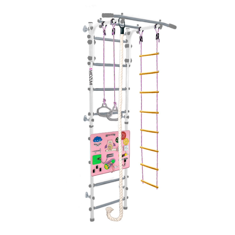 Комплектация: основа - металлическая шведская стенка с турником, гимнастические кольца, канат, веревочная лестница, бизиборд.