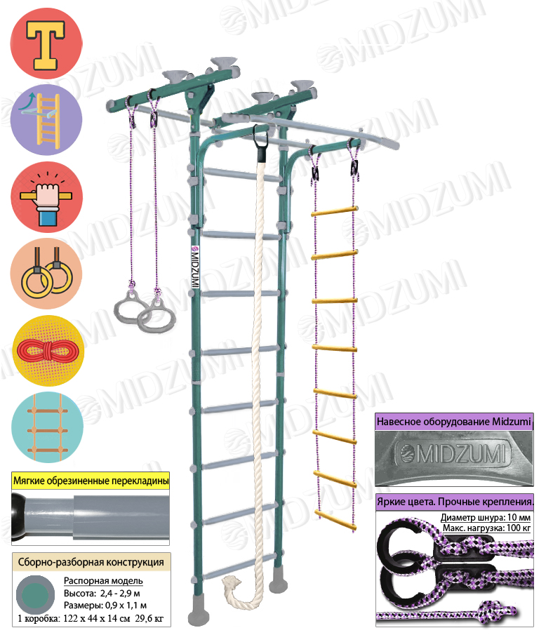 Комплектация: основа - металлическая Т - образная шведская стенка с турником, гимнастические кольца, канат, веревочная лестница