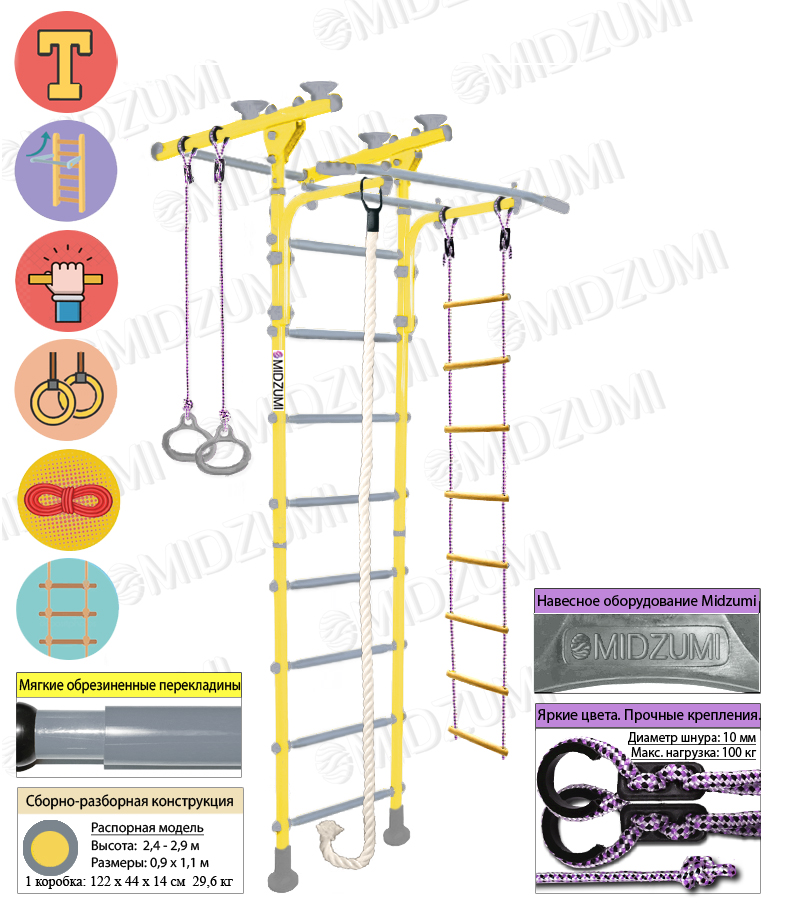 Необузданная детская энергия найдет выход на широкоформатном спортивном комплексе Niji Ton. Стенка этого комплекса не крепится к стене, а ставится враспор между потолком и полом, создавая игровое пространство с двух сторон, при этом, не занимая много места в комнате. Такой комплекс станет украшением детской комнаты и принесут много радости детям, разовьют у них координацию движения, сделают их здоровыми, спортивными, к тому же займут их досуг.