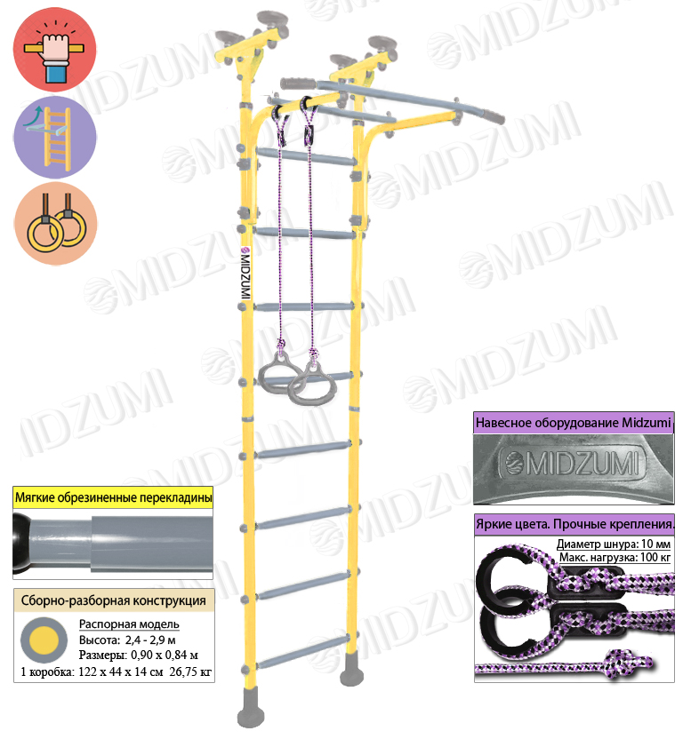 Доступный металлический спортивный комплекс Midzumi Ringu для тех, кто только начинает свой путь в мир домашних комплексов. Компактная конструкция занимает не много места и позволяет проявить фантазию и творческий подход к дополнительным опциям в дальнейшем. Модель в базовой комплектации оснащена самым любимым инвентарем среди детей – кольцами, которые используются с раннего возраста для укрепления разных групп мышц. Диаметр колец подходит для маленькой детской ручки. На кольцах можно висеть, хватаясь руками или ногами. Кроме того, кольца можно использовать как дополнительную опору во время лазания по спорткомплексу.