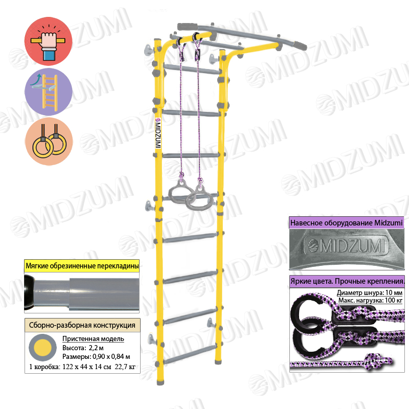 Доступный металлический спортивный комплекс Midzumi Ringu Kabe для тех, кто только начинает свой путь в мир домашних комплексов. Компактная конструкция занимает не много места и позволяет проявить фантазию и творческий подход к дополнительным опциям в дальнейшем. Модель в базовой комплектации оснащена самым любимым инвентарем среди детей – кольцами, которые используются с раннего возраста для укрепления разных групп мышц. Диаметр колец подходит для маленькой детской ручки. На кольцах можно висеть, хватаясь руками или ногами. Кроме того, кольца можно использовать как дополнительную опору во время лазания по спорткомплексу.