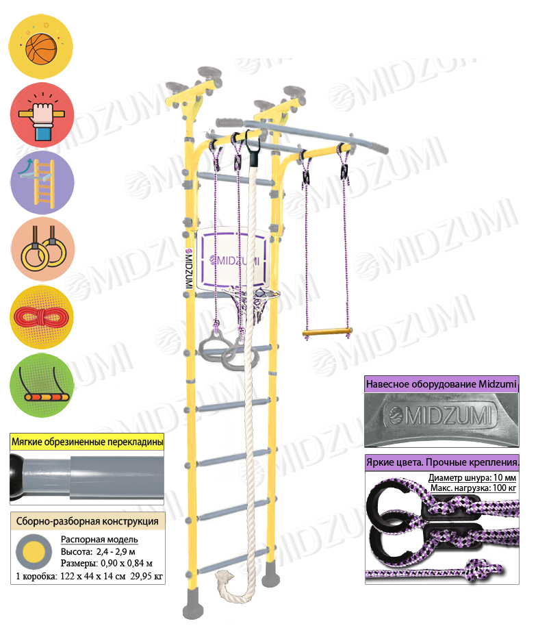 Комплектация: основа - металлическая шведская стенка с турником, гимнастические кольца, канат, трапеция, баскетбольное кольцо Midzumi малое