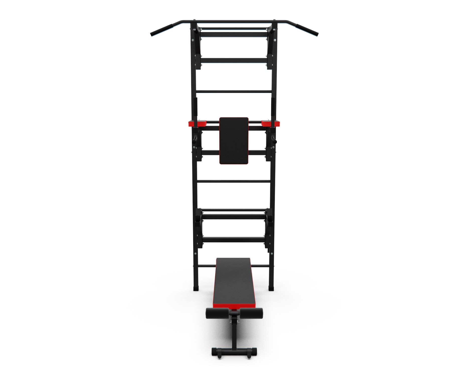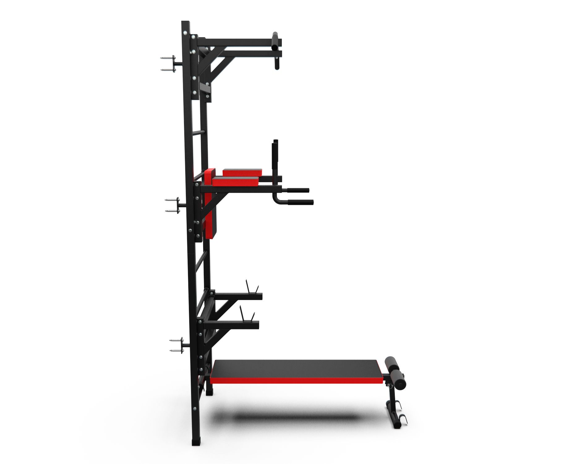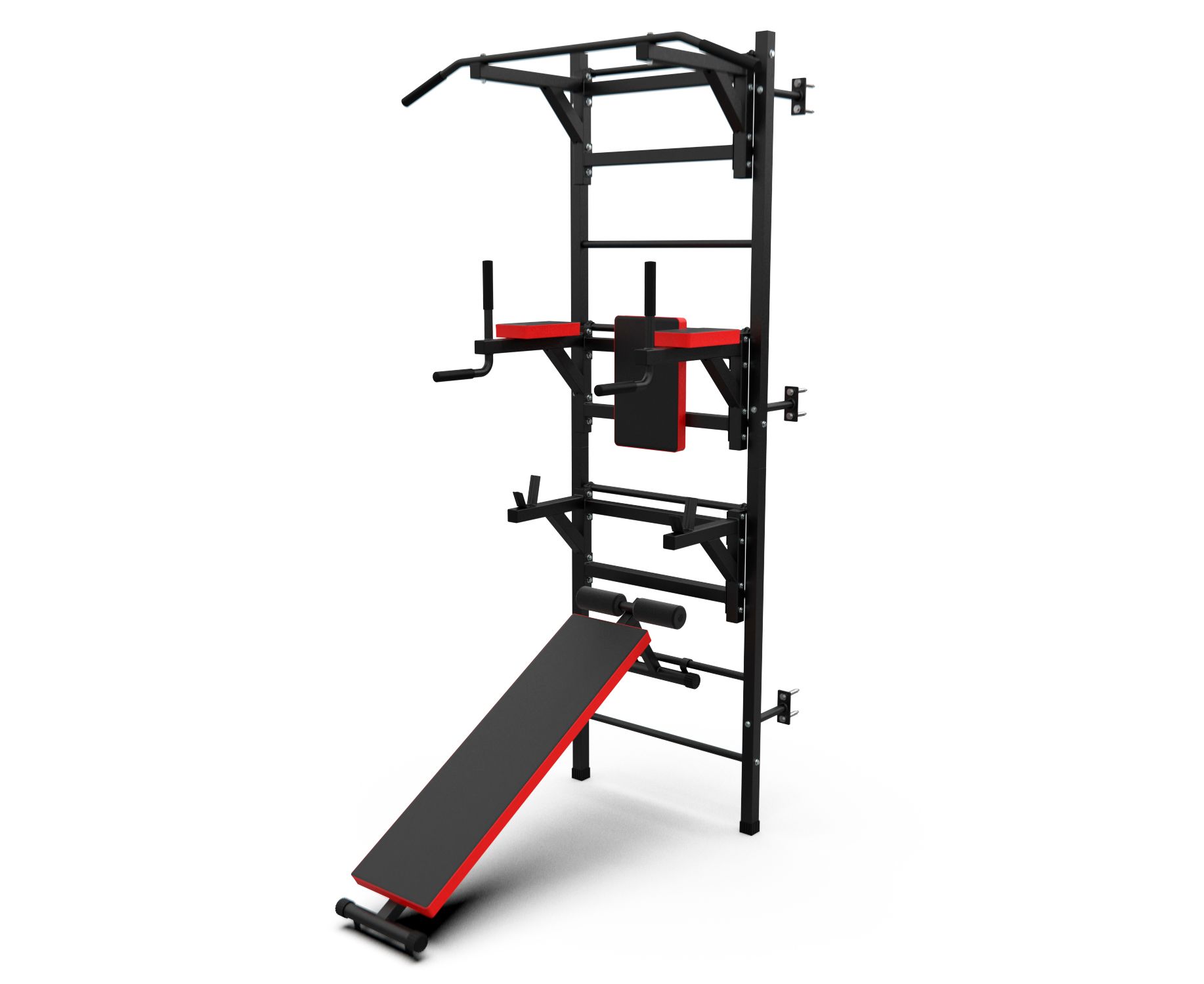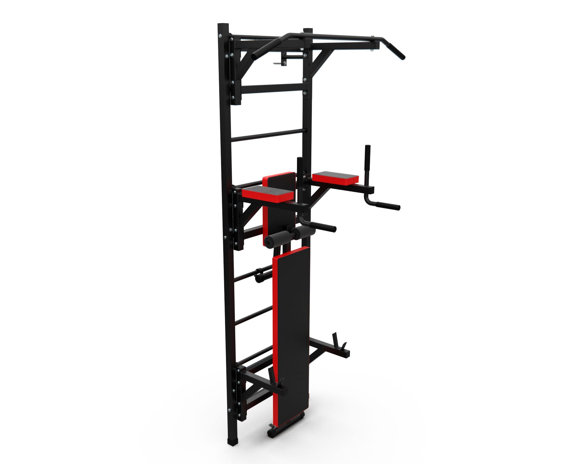 Турник длиной 99 см оснащён мягкими неопреновыми ручками, очень легко перевешивается на перекладины шведской стенки, что позволяет менять его высоту. Расстояние от ручек турника до шведской стенки (вынос турника) - 72 см. Вынос брусьев – 87 см, размер подушки под спину 42 х 25 см, а её толщина 5 см. Подушки подлокотников размерами 25 х 13 х 5 см, а поручни длиной 32 см диаметром 25 мм и толщиной стали 1,5 мм.