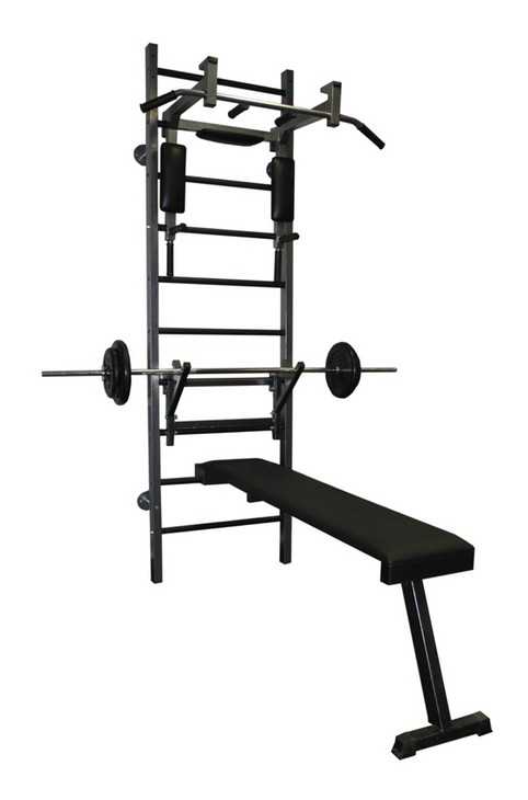 Комплектация: Шведская стенка + турник-брусья-пресс, скамья для жима, упоры для штанги