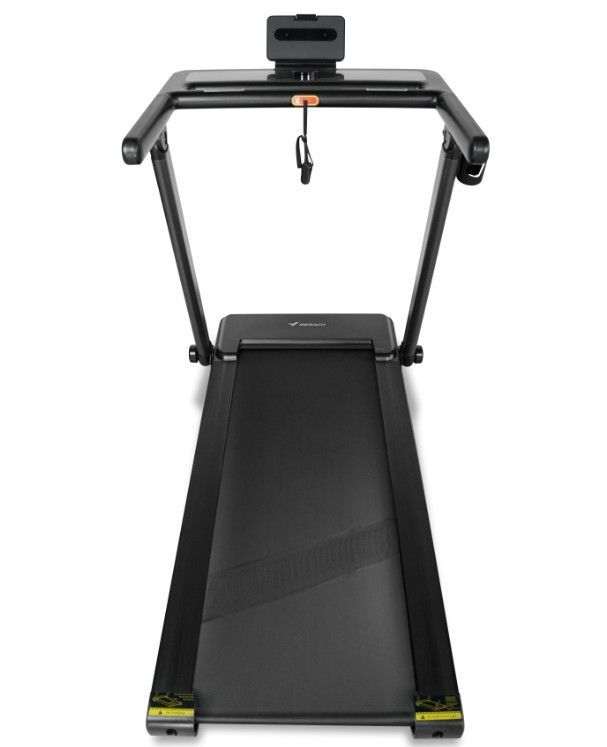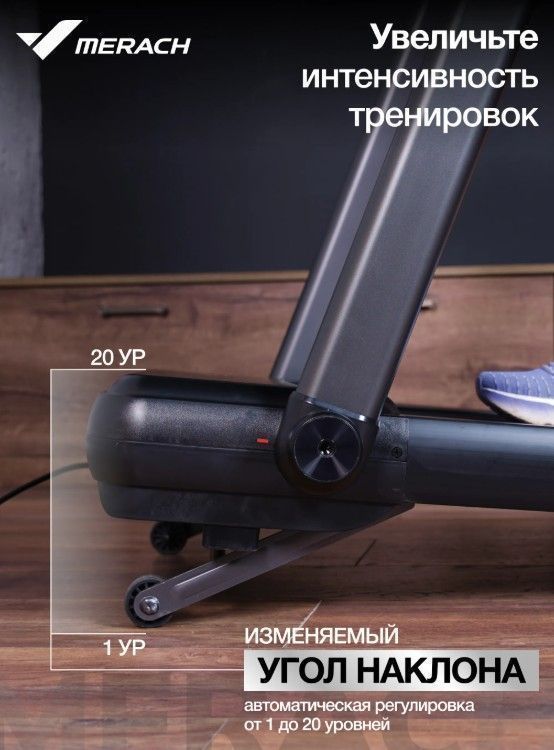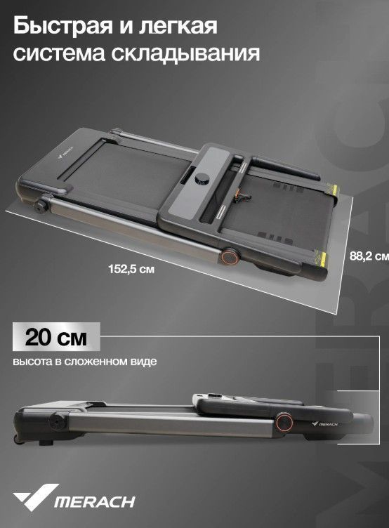 ОписаниеБеговая дорожка MERACH MR-T07 – это идеальное решение для домашних тренировок, обеспечивающее высокую эффективность и комфорт. С максимальной нагрузкой до 150 кг и современными технологиями, она подходит для пользователей с любым уровнем подготовки, помогая достигать поставленных фитнес-целей. Модель оснащена мощным двигателем мощностью 1.25 л.с. (пиковая мощность – 2.5 л.с.), позволяющим развивать скорость от 1 до 14 км/ч. Беговое полотно размером 120 см на 48 см выполнено из антискользящего материала и дополнено амортизационной системой, состоящей из 4 динамических эластомеров VCS™ и системы Soft LEG™, что обеспечивает безопасность и комфорт во время тренировок. Консоль с LCD панелью и LED дисплеем отображает время, скорость, дистанцию, калории и уровень наклона (до 20 уровней с электронной регулировкой). Беговая дорожка MERACH MR-T07 имеет складную конструкцию, что облегчает её хранение и перемещение благодаря транспортировочным роликам. Удобная подставка для планшета или смартфона позволяет заниматься с любимыми развлечениями, а USB-разъем для зарядки устройства обеспечивает дополнительный комфорт. Также предусмотрены сенсорные датчики на поручнях для измерения пульса, что позволяет контролировать состояние во время тренировки. Беговая дорожка MERACH MR-T07 — это ваш надежный партнер на пути к активному и здоровому образу жизни! Ключевые преимущества MERACH MR-T07: • комфортная тренировка: антискользящее беговое полотно и продвинутая амортизационная система делают занятия максимально безопасными и комфортными; • современные функции: Bluetooth для подключения к фитнес-приложениям Merach™, Kinomap™ и Zwift™ добавляет элементы соревновательности и разнообразия в ваши тренировки; • практичные решения: складная конструкция, держатель для бутылки и возможность зарядки смартфона через USB делают использование дорожки удобным и функциональным.