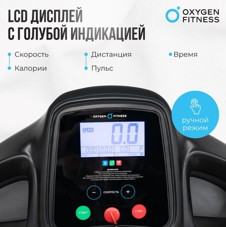 ОписаниеБеговая дорожка OXYGEN FITNESS REVIVE B — это мощный и надежный тренажер, созданный для эффективных тренировок в домашних условиях. С мощностью двигателя в 2.0 л.с. и пиковой мощностью до 4.0 л.с., она обеспечивает плавный и стабильный бег на скорости от 0,3 до 10 км/ч. Это идеальное решение как для новичков, так и для опытных спортсменов, стремящихся разнообразить свои тренировки. Дорожка обладает беговым полотном размером 130 см в длину и 46 см в ширину, выполненным из антискользящего материала толщиной 1.4 мм. Дека из МДФ с парафинированной поверхностью толщиной 15 мм обеспечивает надежную поддержку при занятиях. Также стоит отметить систему амортизации, состоящую из 4 силикон-гелиевых амортизирующих подушек ortho-Deck Masters™ и 4 плоских эластомеров Natural™, что значительно снижает нагрузку на суставы и делает тренировки более комфортными. OXYGEN FITNESS REVIVE B оснащена LCD дисплеем с голубой индикацией, на котором отображаются важные параметры тренировки: время, скорость, дистанция, количество сожженных калорий и пульс. Дорожка поддерживает Bluetooth для работы с мобильными приложениями, такими как Fitshow™, Kinomap™ и Zwift™, что позволяет пользователям отслеживать свой прогресс и получать доступ к разнообразным тренировочным программам. В дополнение, присутствует ручной режим и режим быстрого старта, что делает тренировку еще более удобной. Беговая дорожка OXYGEN FITNESS REVIVE B — ваш надежный партнер на пути к здоровью и физической активности! Ключевые преимущества OXYGEN FITNESS REVIVE B: • мощный двигатель: 2.0 л.с. с пиковой мощностью 4.0 л.с. для эффективных тренирово; • комфортная амортизация: система амортизации с 4 силикон-гелиевыми подушками и плоскими эластомерами для снижения нагрузки на суставы; • интуитивный дисплей: LCD дисплей с голубой индикацией для отслеживания всех ключевых параметров тренировки; • безопасность и удобство: наличие сенсорных датчиков на поручнях, ключ безопасности, страховочный ремень и возможность подключения кардиодатчика; • подходит для реабилитации: специальный дизайн и амортизация делают её идеальной для реабилитации после травм.