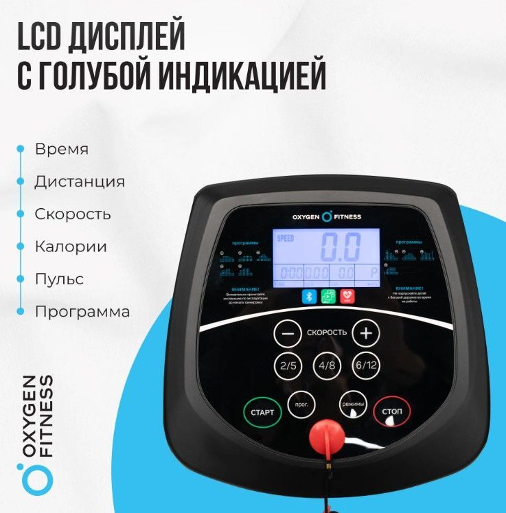 ОписаниеБеговая дорожка OXYGEN FITNESS REVIVE C — это идеальный тренажер для тех, кто стремится восстановиться после травм или поддерживать физическую активность в условиях домашнего комфорта. Разработанная с акцентом на безопасность и комфорт, эта дорожка оснащена мощным двигателем 1.5 л.с. и пиковой мощностью до 3.0 л.с., что позволяет разгоняться до скорости 12 км/ч. Благодаря возможности ручной регулировки угла наклона и продуманной системе амортизации, она помогает минимизировать нагрузку на суставы, что особенно важно для реабилитации. Складная конструкция делает ее удобной для хранения, а компактные размеры позволяют легко разместить ее даже в небольших помещениях. Беговое полотно размером 122 см в длину и 40 см в ширину выполнено из антискользящего материала толщиной 1.4 мм, что обеспечивает безопасность во время занятий. Дека из МДФ с парафинированной поверхностью толщиной 15 мм гарантирует надежную поддержку. Система амортизации состоит из 4 силикон-гелиевых подушек ortho-Deck Masters™ и 4 плоских эластомеров Natural™, что значительно снижает нагрузку на суставы и обеспечивает комфортные условия для тренировки. Ручная регулировка угла наклона с тремя уровнями позволяет настроить тренировку под индивидуальные потребности. OXYGEN FITNESS REVIVE C оснащена LCD дисплеем с голубой индикацией, который отображает важные параметры: время, скорость, дистанцию, количество сожженных калорий, пульс и выбранную программу. Дорожка предлагает 14 различных программ, включая быстрый старт, 9 предустановленных и 3 режима обратного отсчета, а также функцию жироанализатора. Bluetooth-соединение позволяет интегрировать дорожку с мобильными приложениями, такими как Fitshow™, Kinomap™ и Zwift™, что делает тренировки более разнообразными и увлекательными. Беговая дорожка OXYGEN FITNESS REVIVE C — ваш надежный партнер на пути к здоровью и физической активности, обеспечивающий комфорт, безопасность и разнообразие в тренировках! Ключевые преимущества OXYGEN FITNESS REVIVE C: • мощный двигатель: 1.5 л.с. с пиковой мощностью 3.0 л.с. для эффективных тренировок; • комфортная амортизация: система амортизации с силикон-гелиевыми подушками и плоскими эластомерами для снижения нагрузки на суставы; • разнообразие программ: 14 программ, включая жироанализатор и режимы обратного отсчета для достижения ваших фитнес-целей; • интуитивный дисплей: LCD дисплей с голубой индикацией для отслеживания всех ключевых параметров тренировки; • подходит для реабилитации: специальный дизайн и амортизация делают её идеальной для реабилитации после травм.