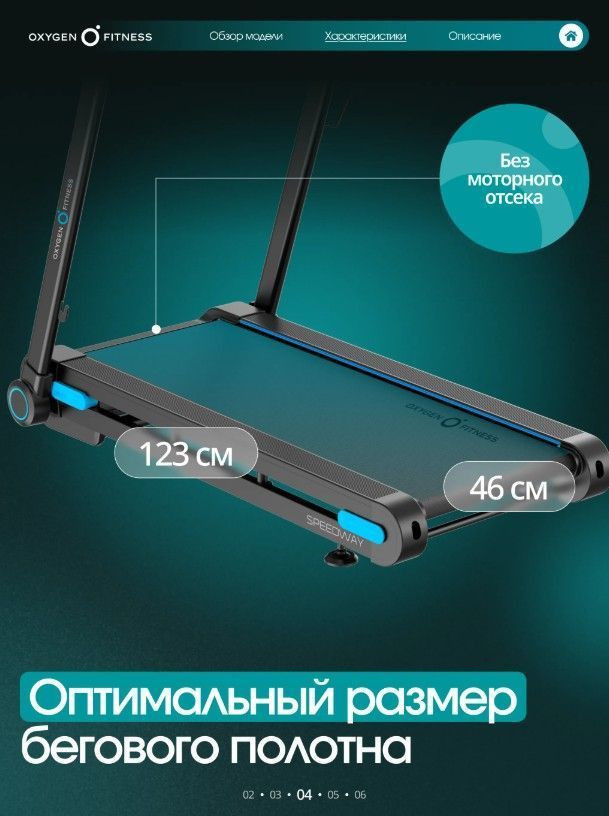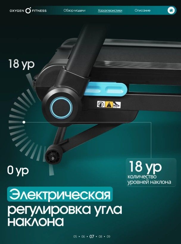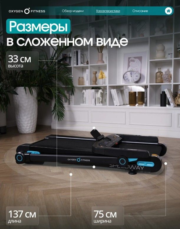 ОписаниеOXYGEN FITNESS SPEEDWAY — функциональная домашняя беговая дорожка с электронным углом наклона, продвинутой амортизацией и интерактивной интеграцией с Kinomap™. Бесщеточный двигатель 2.25 л.с. Fuji Electric (пиковая мощность 4.4 л.с.) обеспечивает стабильную и тихую работу. Скорость от 1 до 16 км/ч подходит для ходьбы, лёгкого и интенсивного бега. Полотно 123 × 46 см и дека 15 мм создают устойчивую и безопасную зону для тренировки. Система амортизации сочетает подушки dualFLEX™, эластомеры Natural™ и VCS™, снижая ударную нагрузку на суставы. 18 уровней наклона позволяют варьировать интенсивность и имитировать подъёмы. Bluetooth и интерактивная интеграция с Kinomap™ автоматически регулируют угол наклона по профилю маршрута. LED-дисплей отображает основные параметры тренировки. 17 программ, сенсорные датчики пульса, управление скоростью и наклоном на поручнях, подставка под планшет, держатель для бутылки. Прочная рама с антикоррозийной обработкой, ударопрочный пластик HIPS. Складная конструкция, транспортировочные ролики. Максимальный вес пользователя — 130 кг. OXYGEN FITNESS SPEEDWAY — технологичное решение для эффективных домашних тренировок с расширенным функционалом и комфортной амортизацией.