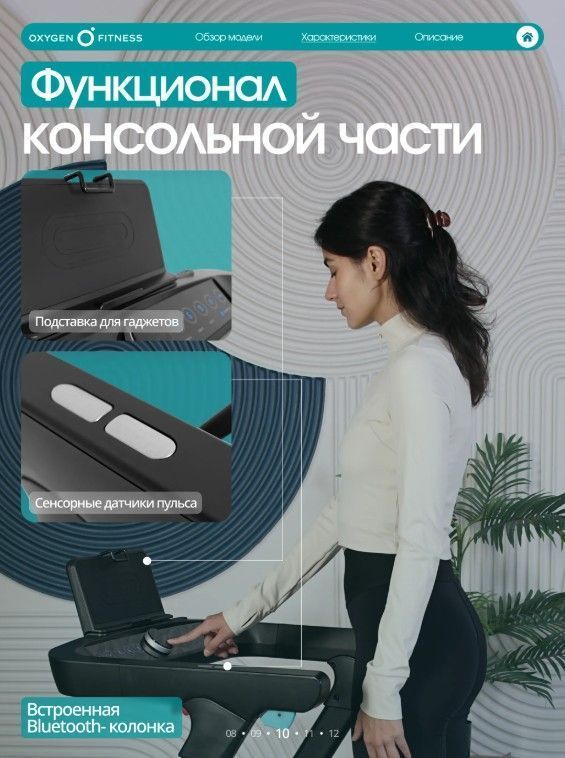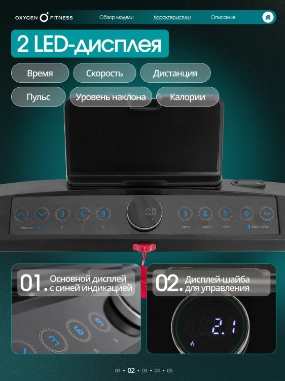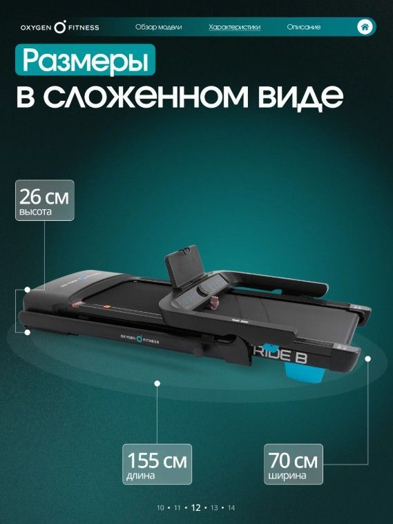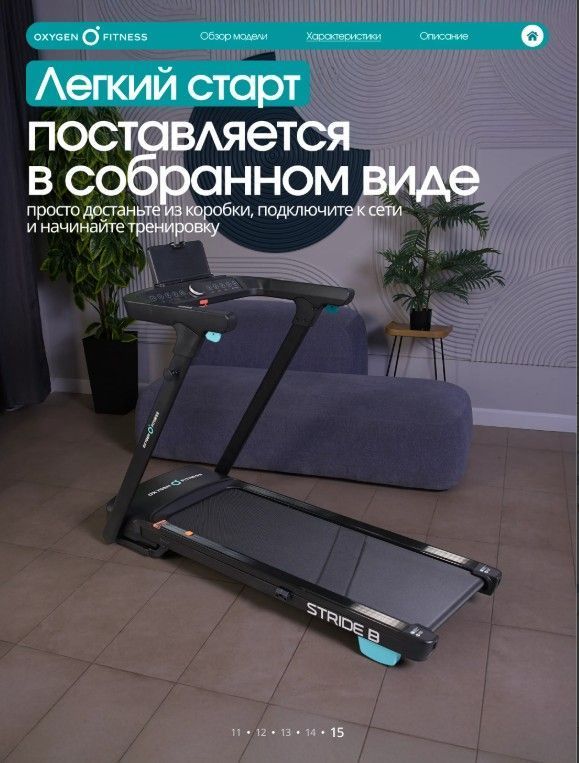 ОписаниеБеговая дорожка OXYGEN FITNESS STRIDE B - это идеальный выбор для домашних тренировок, сочетающий в себе мощность, функциональность и современный дизайн. С весом 45 кг и прочной конструкцией, она обеспечивает стабильность и надежность во время занятий. Эта дорожка станет вашим верным помощником на пути к поддержанию физической формы и улучшению здоровья. Дорожка оснащена мощным двигателем в 1,75 л.с. (пиковая мощность 3,0 л.с.), что позволяет развивать скорость от 1 до 14 км/ч. Беговое полотно шириной 42 см и длиной 120 см гарантирует комфортные тренировки, а система амортизации на основе 6 плоских эластомеров Natural™ и системы Soft LEG™ обеспечивает мягкость и защиту суставов. Электронная регулировка угла наклона (15 уровней) позволяет разнообразить тренировки и адаптировать их под ваши цели. Консоль с LED-дисплеем отображает все важные параметры: время, скорость, дистанцию, калории и пульс. Беговая дорожка OXYGEN FITNESS STRIDE B предлагает множество удобств, включая AUX и USB разъемы для подключения мультимедиа, а также Bluetooth-колонки для прослушивания музыки во время тренировок. Подставка для планшета или смартфона позволяет вам наслаждаться любимыми фильмами или программами во время занятий. Механическая система складывания и наличие транспортировочных роликов делают хранение и перемещение дорожки простым и удобным. Беговая дорожка OXYGEN FITNESS STRIDE B - ваш надежный партнер в достижении спортивных целей и поддержании активного образа жизни прямо у вас дома! Ключевые преимущества OXYGEN FITNESS STRIDE B: • мощный двигатель и система амортизации для комфортного бега без нагрузки на суставы; • LED-дисплей с белой индикацией, подставка для планшета и сенсорные датчики на поручнях для контроля пульса; • легкое складывание и небольшой размер в сложенном виде (155 см в длину и 26 см в высоту) для удобного хранения.