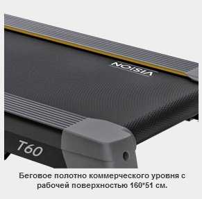 Достаточно мощная и в то же время очень качественная и надежная.Тренажер отлично зарекомендовал себя надежным многолетним использованием в залах средней и высокой. Рама дорожки VISION T60 надежна и с запасом выдерживает пользователя весом 160 кг. Она построена на тяжелой высокопрочной станине (Extra-Heavy Gauge) с использованием пропитанной воском деки толщиной 25.4 мм. и двухслойного полотна коммерческого уровня со сложным многослойным полимерным плетением. Комфорт тренировки обеспечивается большой площадью бегового полотна размером 160*51 см., настроенными на оптимальную жесткость эластомерами различной плотности (рабочая поверхность дорожки разделена на 4 зоны, каждая из которых имеет свой уровень амортизации для имитации естественной нагрузки на стопу во время бега), скоростным диапазоном от 0.8 до 20 км./ч. и электрически изменяемым углом наклона от 0 до 15%. LED консоль, состоящая из одного большого дисплея для вывода профиля тренировки и пяти второстепенных дисплеев с остальными параметрами, максимально информативна и имеет простую понятную навигацию. В предустановленный пакет входят 9 тренировочных режимов - помимо классических, здесь есть пульсозависимая программа, программа снижения веса и фитнес-тест.