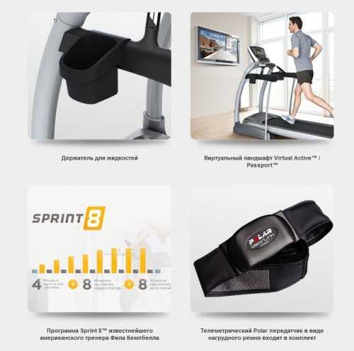Консоль Elegant является разумным компромиссом для тех пользователей, которые готовы платить за комфорт, расширенную функциональность и стильный внешний вид, однако не видят необходимости в приобретении топовой комплектации с максимальными возможностями. Итак, что есть? Во-первых, это 10-ти дюймовый полноцветный LCD дисплей c управлением по принципу ATM. Он с первой минуты создает самые позитивные эмоции – это даже не столько информативность и удобство управления, сколько ощущение обладания высокотехнологичным продуктом. Во-вторых, встроенная в консоль видеокарта для воспроизведения уникальной технологии так называемого «виртуального ландшафта» Virtual Active™ и Passport™. Виртуальный ландшафт является сложным комплексом высокотехнологических решений с использованием самых последних достижений в электронике, программном обеспечении и биомеханике. В основе лежит использование интерактивного видео, синхронизированного с движениями пользователя. Сюжеты для Virtual Active™ и Passport™ сняты и подготовлены специально приглашенной командой профессиональных документалистов. Отличие Virtual Active™ и Passport™ состоит в том, что в первом случае видео ролики воспроизводятся на консоли и не требуют никакого дополнительного оборудования, а для второго подразумевается наличие внешнего телевизора и специального роутера. Для комфортного воспроизведения Virtual Active™ консоль обладает встроенными динамиками. Из других преимуществ Elegant следует выделить расширенный пакет предустановленных тренировочных профилей. Помимо увеличенного количества целевых режимов, здесь есть целых 4 вариации на тему пульсозависимых программ, для более корректного и удобного использования которых в консоль установлен телеметрический приемник (передатчик в виде нагрудного ремня входит в комплект). Безусловного упоминания стоит и уникальный программный комплекс Sprint 8™ известнейшего американского фитнес тренера Фила Кэмпбэлла. Режим направлен на преодоление снижения тонуса мышц и количества гормона роста (соматотропина) в среднем возрасте. Sprint 8™ также борется с увеличением веса, способствует укреплению общего иммунитета и получению “энергетической подпитки” организма. И все это требует не более 3-ех занятий по 20 минут в неделю!