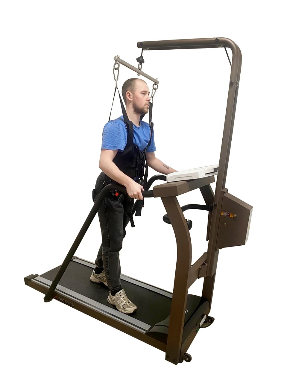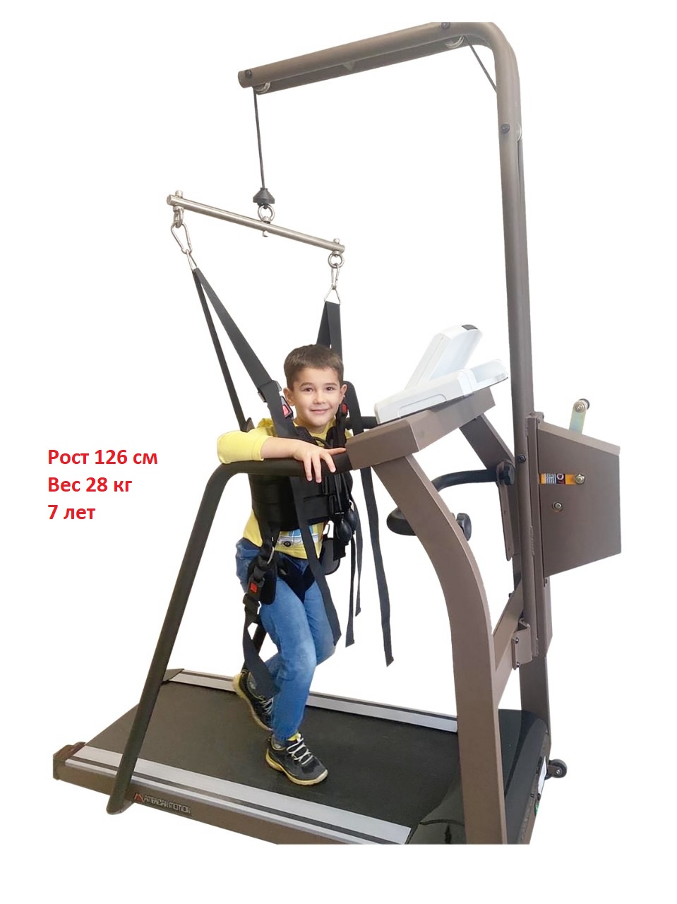 Встроенная система подвеса рассчитана только для людей весом до 80 кг. Подвесная система регулируется вручную вращением рукоятки. Диапазон высоты крепления подвесного жилета 100-170 см от бегового полотна.