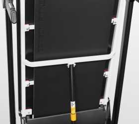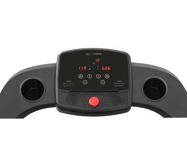 За удобство складывания отвечает двухфазная гидравлическая система Easy Drop™ - она существенно облегчает складывание дорожки, а при раскладывании обеспечивает медленное опускание полотна в последней фазе, гарантируя легкость и безопасность. Перемещение тренажера происходит за счет 2-ух транспортировочных роликов.Все показания тренировочного процесса размещены на 3 ярких буквенно-цифровых LED-дисплеях. Данные видно при любом освещении. В памяти консоли содержится 12 встроенных программ, в которых используются различные виды тренировок (быстрая ходьба, легкий бег, бег трусцой, фартлек, аэробный бег, сжигание жира, интервальный бег, снижение веса, бег на выносливость, подготовка к марафону, развитие скорости, темповая тренировка). Сделать упор на конкретный показатель можно при помощи режима целевых тренировок (дистанция, калории, время). Помимо установленных программ, можно воспользоваться регулируемым ручным режимом, а система жироанализатора Body Fat позволит получить максимально точный процент доли жира в организме. Для измерения пульса пользователя установлены сенсорные датчики пульса, расположенные на ручках беговой дорожки. Там же находятся и дополнительные кнопки переключения скорости, а также старта и окончания тренировки. Цель такого расположения дополнительных кнопок регулирования – удобство и безопасность, особенно во время занятий на высоких скоростях. Приятной опцией является подставка под телефон или планшет и место для емкостей.