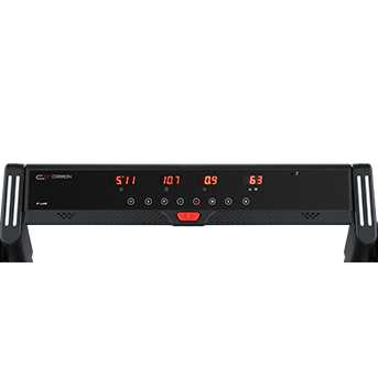 Консоль T510 SLIM представляет собой панель с черной акриловой поверхностью. Абсолютно все кнопки сенсорные. 4 буквенно-цифровых LED-дисплеев выводят следующие показатели: время, скорость, дистанция, калории, пульс. В памяти консоли содержится 18 программ, 15 из которых помогут пользователям начать тренировочный процесс в независимости от их уровня подготовки (ходьба, быстрая ходьба, средний бег, бег трусцой, снижение веса, темповая тренировка, разминочный бег, подготовка к марафону, сжигание жира, аэробный бег, развитие скорости, интервальные тренировки, развитие выносливости, легкий бег, фартлек). Также можно воспользоваться пульсозависимой программой. Для измерения пульса установлены сенсорные датчики и встроен высокоточный беспроводной приемник. Чтобы определить точные показатели пульса рекомендуется использовать телеметрический ремень-передатчик Polar T34. Жироанализатор Body Fat позволит получить максимально точный процент доли жира в организме. AUX разъем предназначен для подключения музыкальных устройств и прослушивания аудиофайлов на встроенных динамиках. Подставка под планшет или смартфон имеет специальный регулятор, необходимый для фиксации гаджетов различных размеров.
