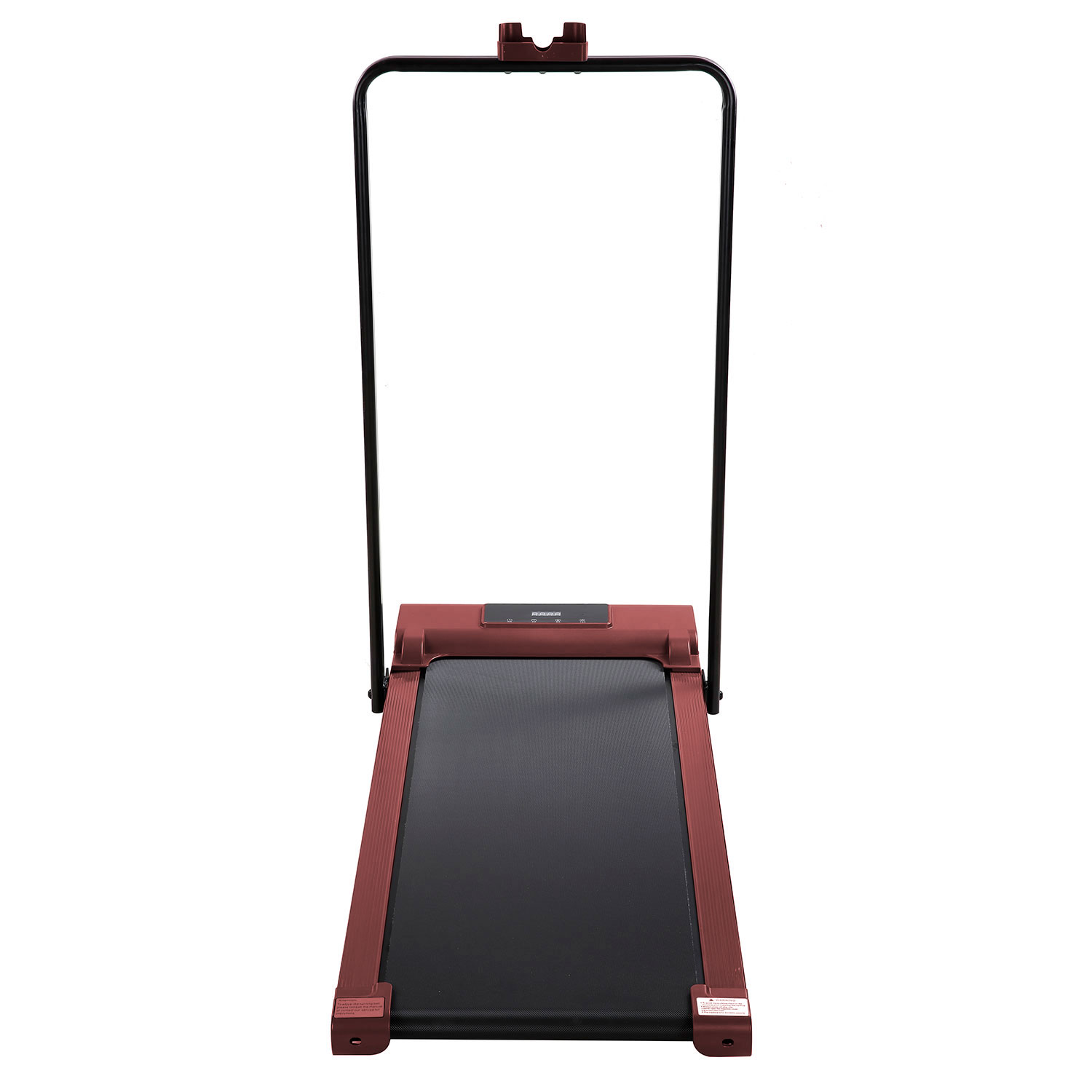 На дорожке установлен удобный складной поручень с держателем под девайс и пульт. После занятий поручень убирается, и тренажер получается очень тонким, всего 16 см.