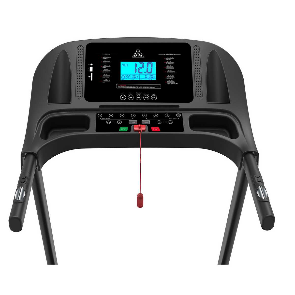На поручнях так же расположены "быстрые кнопки" - это кнопки запуска и остановки бегового полотна, и кнопки изменения скорости. Это позволяет не отрывать руки с поручней во время тренировки.