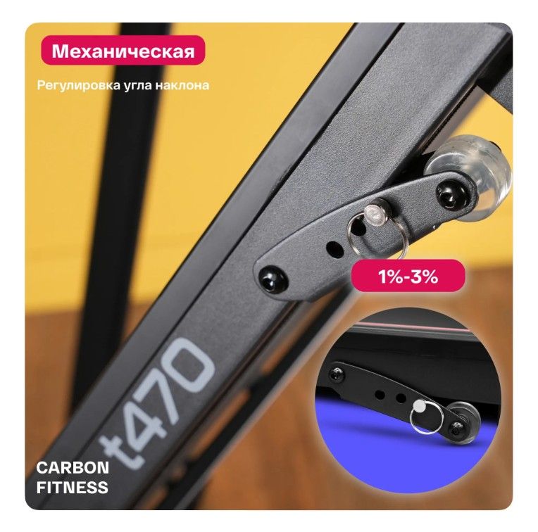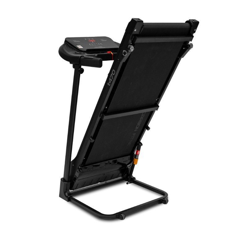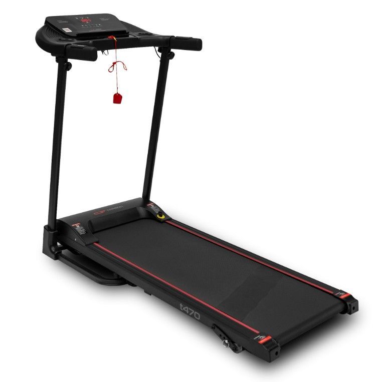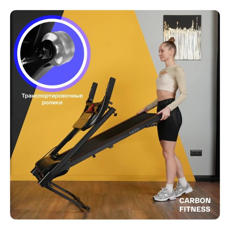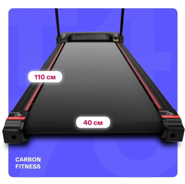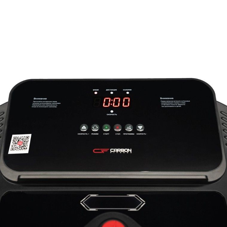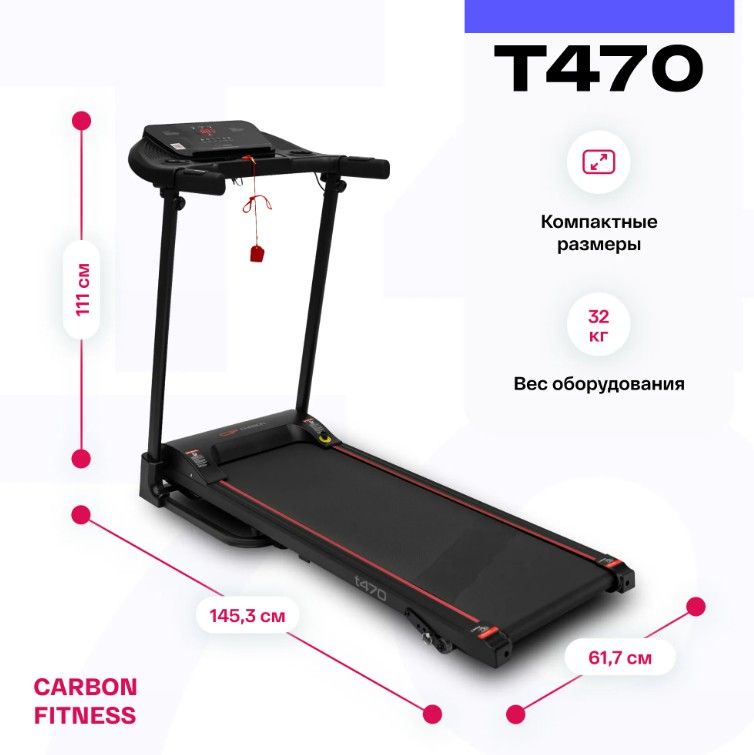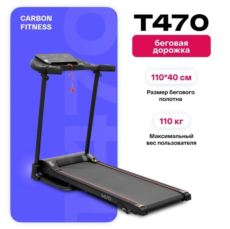 ОписаниеБеговая дорожка CARBON FITNESS T470 - это высококачественное оборудование, созданное для эффективных и комфортных тренировок в домашних условиях. Сочетая в себе передовые технологии, продуманный дизайн и широкий функционал, эта модель станет надежным помощником на пути к достижению ваших фитнес-целей. CARBON FITNESS T470 оснащена бесщеточным двигателем мощностью 1,75 л.с. с пиковым показателем 3 л.с., обеспечивая плавный разгон скорости от 1 до 14 км/ч. Беговое полотно размером 110x40 см с толщиной 1,6 мм и парафинированной декой из МДФ толщиной 12 мм гарантирует комфорт и безопасность во время тренировок. Система амортизации с 2 плоскими силиконовыми эластомерами Natural S™, 4 плоскими эластомерами Natural™ и 2 эластомерами v-Absorbers™ смягчает нагрузку на суставы. Консоль дорожки оснащена тремя LED-дисплеями с красной индикацией, отображающими ключевые параметры тренировки: время, скорость, дистанцию, калории, жироанализатор. Интерфейс поддерживает русский и английский языки. Дополнительные функции включают в себя: сенсорные датчики пульса на поручнях и встроенную Bluetooth-колонку для воспроизведения музыки со смартфона. Возможность интеграции с мобильными приложениями Spax™ и Kinomap™ делает тренировки еще более увлекательными. Беговая дорожка CARBON FITNESS T470 имеет компактные размеры в сложенном виде (85x61,7x120 см) и оснащена транспортировочными роликами, что упрощает перемещение и хранение. Максимальный вес пользователя составляет 110 кг, делая дорожку подходящей для большинства пользователей. Дополнительные удобства включают наличие ключа безопасности, систему легкой ручной смазки бегового полотна и легкого складывания. Ключевые преимущества CARBON FITNESS T470: • мощный бесщеточный двигатель 1,75 л.с. (пиковая мощность 3 л.с.) для плавного разгона до 14 км/ч; • комфортное беговое полотно размером 110x40 см с парафинированной декой толщиной 12 мм; • эффективная система амортизации для снижения нагрузки на суставы; • многофункциональная консоль с тремя LED-дисплеями и поддержкой русского/английского языков; • интеграция с мобильными приложениями Spax™ и Kinomap™ для увлекательных тренировок.
