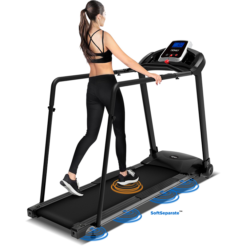 Модель Family TM 250R это специализированная электрическая беговая дорожка для домашней реабилитации или для занятий ходьбой, оборудована усиленными поручнями вдоль всего тренажера для комфорта и безопасности пользователей с ограниченными возможностями, возрастных пользователей или после травмирования. Надежный двигатель обеспечивает стабильный ход, поддерживает скорость от 0,3 до 6 км/ч., беговое полотно 400 х 1220 мм рассчитаны на удобный медленный шаг или длительные прогулки средней скорости. Амортизация SoftSeparate™ состоит из 8 эластомеров по периметру, 2-х типов жёсткости, они создают естественную амортизацию, оптимальную для ходьбы, обеспечивая безопасность суставов и комфорт движения. Качественная ламинированная дека 16 мм и прочная рама рассчитаны для пользователей весом до 100 кг.