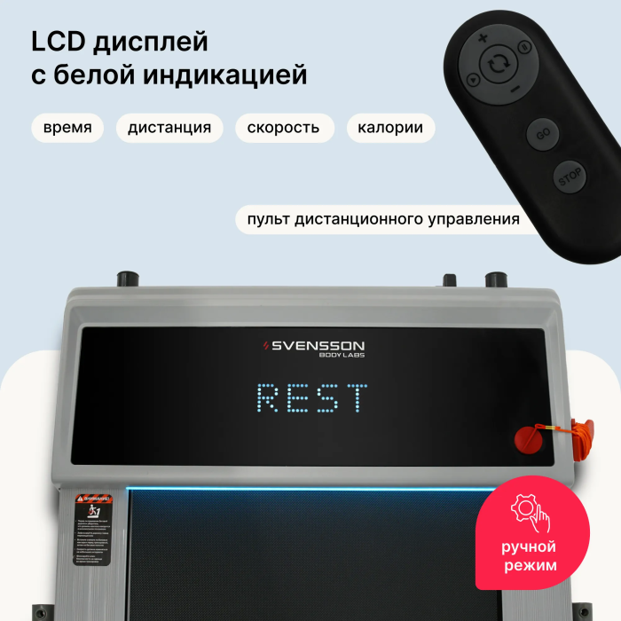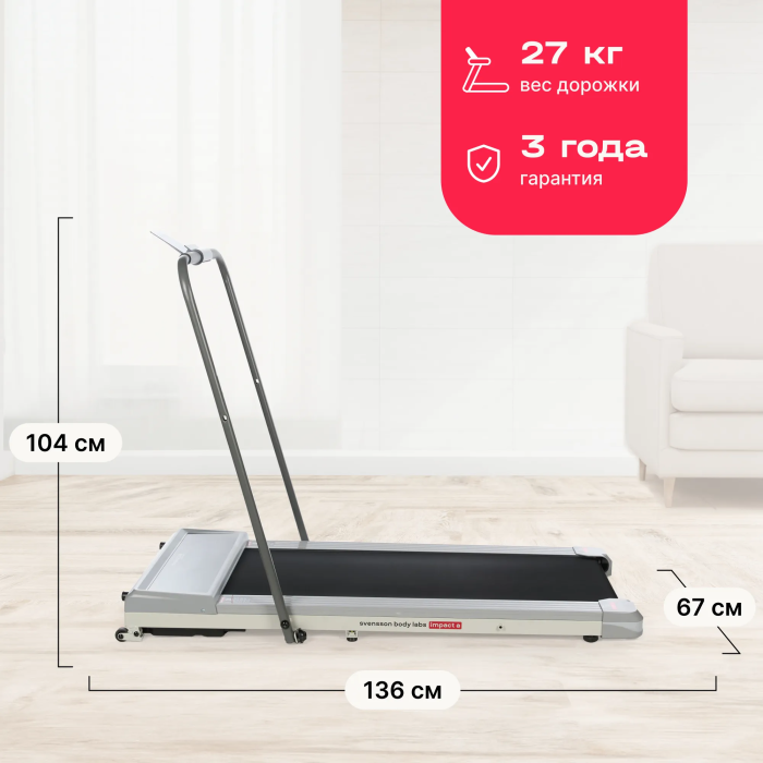 ОписаниеSvensson Body Labs IMPACT A — беговая дорожка, воплощающая стиль и технологии в новом светлом монохромном дизайне. Эта модель создана для домашних тренировок, сочетая современный минимализм, комфорт и надежность. Она идеально впишется в любой интерьер и станет надежным спутником на пути к здоровому образу жизни. Электрическая беговая дорожка оснащена бесщеточным двигателем Mitsubishi Motors Corporation с мощностью 1,5 л.с. и пиковым показателем 2,8 л.с., что обеспечивает плавный разгон скорости от 1 до 12 км/ч. Комфортное беговое полотно размером 105х41 см с толщиной 1,6 мм и парафинированной декой (12 мм) дополнено системой BlueLine Safety — ярко-синей подсветкой моторного отсека, которая обеспечивает визуализацию линии стопа для большей безопасности. Два уровня механического наклона полотна позволяют варьировать нагрузку, а LED-дисплей с белой индикацией отображает ключевые параметры тренировки. Для синхронизации с мобильными приложениями Spax™ и Kinomap™ предусмотрен встроенный Bluetooth. IMPACT A сочетает компактность, функциональность и готовность к использованию прямо из коробки. Вес тренажера составляет всего 27 кг, а в сложенном виде его размеры достигают 142х27х14 см, что позволяет хранить дорожку в вертикальном положении у стены. При этом дорожка выдерживает максимальный вес пользователя до 110 кг, что делает ее универсальным решением для всей семьи. Ключевые преимущества Svensson Body Labs IMPACT A: • скорость от 1 до 12 км/ч; • комфортное беговое полотно 105х41 см; • подсветка BlueLine Safety для безопасности; • синхронизация с приложениями через Bluetooth; • легкость складывания и вертикальное хранение.