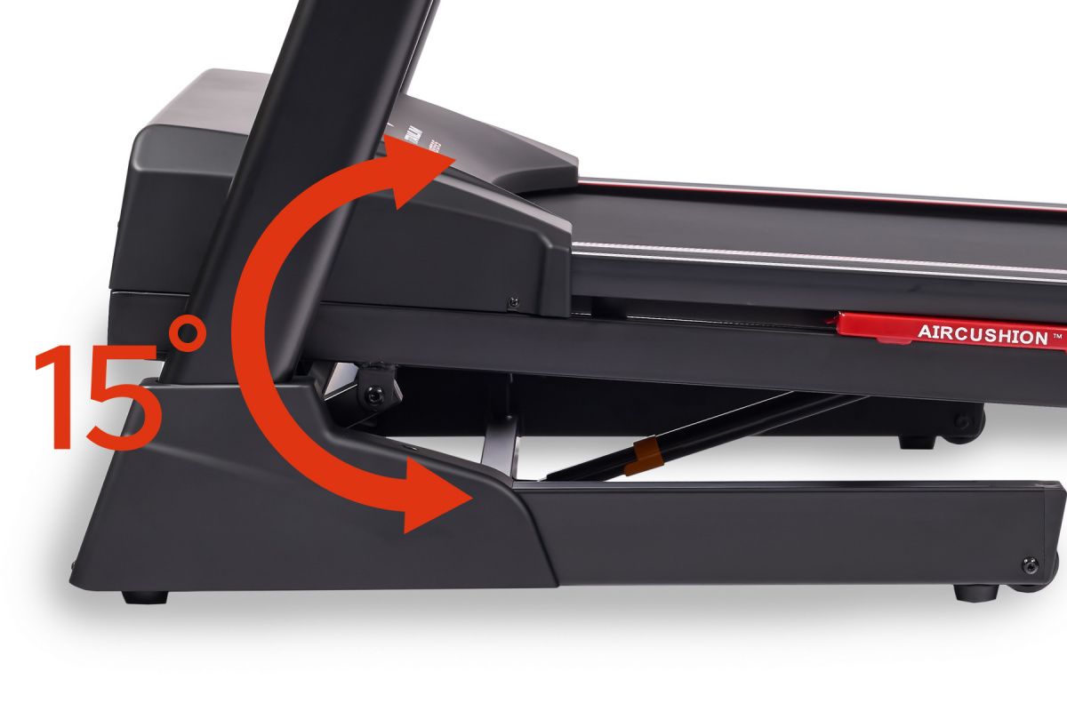 По своих биомеханическим показателям Titanium Masters Physiotech TGF ориентирован на абсолютно любые категории пользователей – от начинающих до профессиональных спортсменов. В моторном отсеке – надежный, проверенный временем двигатель японской Fuji Electric мощностью 3,25 л.с. постоянного тока, он разгоняет дорожку до внушительных 16 км/ч. Размер бегового полотна составляет 138 см. в длину и 46 см. в ширину – это отличные показатели, обеспечивающие безопасность, комфорт и свободу движений на любых скоростях. Электрически изменяемый угол наклона от 0 до 15% усиливает нагрузку и общую эффективность тренировки, особенно в связке с встроенными тренировочными программами. За качество скольжения отвечает многослойное полотно NНT-218 толщиной 1,8 мм. швейцарского бренда Habasit и парафинированная дека толщиной 18 мм. Двухфазная гидравлическая система складывания easy-DROP™ существенно облегчает складывание дорожки, а при раскладывании обеспечивает медленное опускание полотна в последней фазе, гарантируя легкость и безопасность. Перемещение дорожки происходит за счет 2-х транспортировочных роликов.