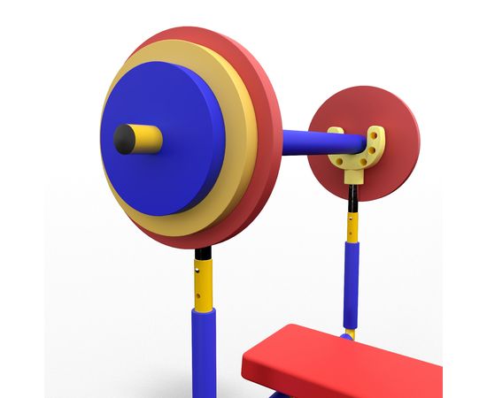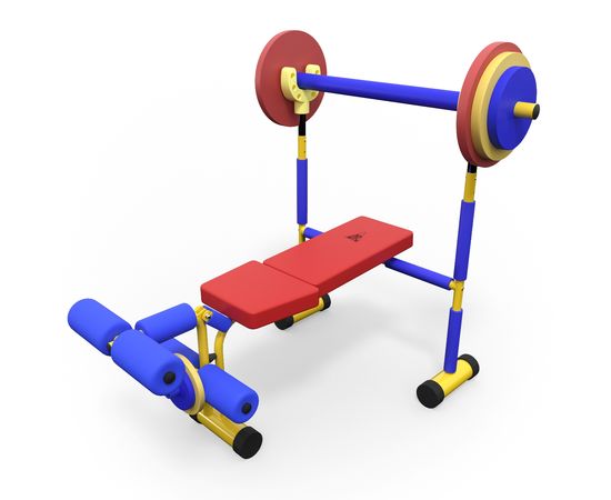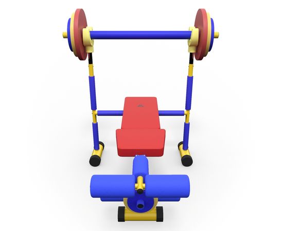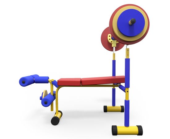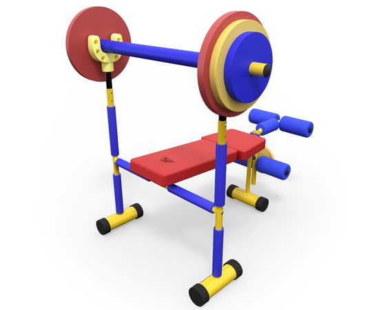Скамья продается в комплекте со штангой и 8 весовыми пластинами разной массы. Поднятия штанги и жим ногами на специализированной детской скамье укрепляет мышечный корсет и развивает выносливость ребенка.