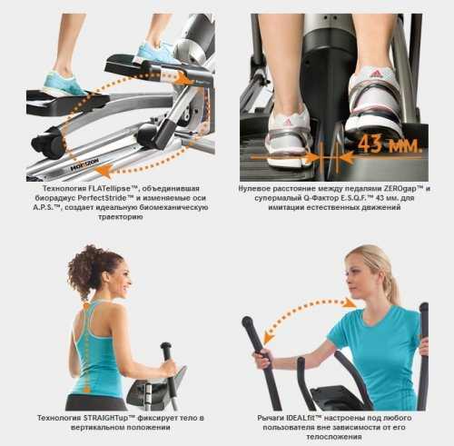 Расстояние между педалями сведено до нуля, а непосредственное расстояние между стопами (Q-Фактор) составляет 43 мм. Тело находится строго в вертикальном положении. Рама имитирует естественное состояние человека во время бега, жестко фиксируя вертикальное положение тела. Важной особенностью FLATellipse™ является сохранение одинаковой нагрузки на всем цикле движения (отсутствуют т.н. "мертвые зоны"). Рычаги настроены под любого пользователя. Специально разработаны с учетом разницы в росте и телосложении пользователей. Низкая высота стартового положения. Для того, чтобы занять стартовое положение, надо подняться всего лишь на 24.5 см. Это не только удобно для пользователей невысокого роста либо старшего возраста, но и снижает вероятность травмирования при аварийных остановках. Кроме того, низкая высота стартового положения обеспечивает большую устойчивость тренажера. Длина шага составляет практически максимальные для домашнего эллипсоида 508 мм. Для увеличения эффективности тренажер снабжен механически изменяемым углом наклона, что позволяет пользователю более акцентированно загружать необходимые группы мышц. 12 предустановленных программ. Запатентованная инновационная технология "Центр Управления Целями™" (Goal Center™) позволяет накапливать тренировочные данные и оценивать их без использования бумажных графиков или дневников. Мультимедийная составляющая представлена входом для CD/MP3 и колонками с качественным звучанием. Встроенный в консоль вентилятор является незаменимой вещью в жаркие летние дни. Данная модель - эллиптический эргометр HORIZON ENDURANCE 4 (2013) – является самым эффективным решением для домашних тренировок. Удобный и качественный, на сегодняшний день он превосходит абсолютно все существующие аналоги.