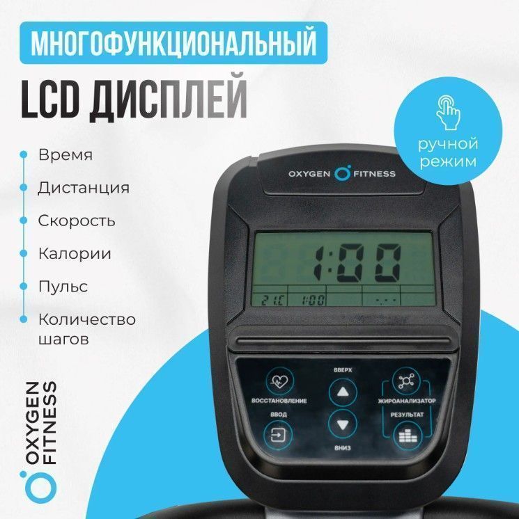 ОписаниеЭллиптический тренажер OXYGEN FITNESS CASCADE M — это идеальный выбор для тех, кто хочет организовать эффективные тренировки в домашних условиях. Он разработан с учетом современных требований к фитнес-оборудованию и подходит как для новичков, так и для более опытных пользователей. С его помощью вы сможете укрепить сердечно-сосудистую систему, улучшить выносливость и сжигать калории, не нагружая суставы. Компактные размеры делают его отличным вариантом для квартир и небольших помещений. Тренажер работает на основе магнитной системы нагружения magicFLOW™ PLUS и предлагает 8 уровней нагрузки, что позволяет пользователю настраивать интенсивность тренировок в зависимости от своих целей. Инерционный вес маховика составляет 22 кг, что обеспечивает стабильность и плавность хода. Длина шага в 450 мм и расстояние между педалями 200 мм способствуют естественному движению, минимизируя нагрузку на суставы, а трехкомпонентный шатун обеспечивает надежную и эффективную работу тренажера. Консоль тренажера оснащена монохромным LCD-дисплеем, на котором отображаются ключевые параметры: время, скорость, дистанция, калории, пульс и количество шагов. Удобные двухпозиционные нескользящие рукоятки с сенсорными датчиками пульса обеспечивают комфорт и безопасность во время занятий. Тренажер имеет ручной режим тренировки с функцией жироанализатора, что позволяет пользователю более эффективно отслеживать свои результаты. Эллиптический тренажер OXYGEN FITNESS CASCADE M — это надежный и функциональный инструмент для достижения ваших фитнес-целей в комфортной домашней обстановке. Ключевые преимущества OXYGEN FITNESS CASCADE M: • компактность и мобильность: с транспортировочными роликами и компенсаторами неровностей пола, тренажер легко перемещать и устанавливать в любом месте; • простота использования: отсутствие необходимости подключения к сети и механическая регулировка нагрузки делают тренажер удобным для эксплуатации; • комфорт и безопасность: антискользящие педали увеличенного размера и сенсорные датчики на поручнях обеспечивают надежность и удобство во время тренировок; • прочные материалы: высокопрочная рама с антикоррозийной обработкой и двухслойной покраской гарантирует долговечность и надежность тренажера даже при интенсивном использовании.