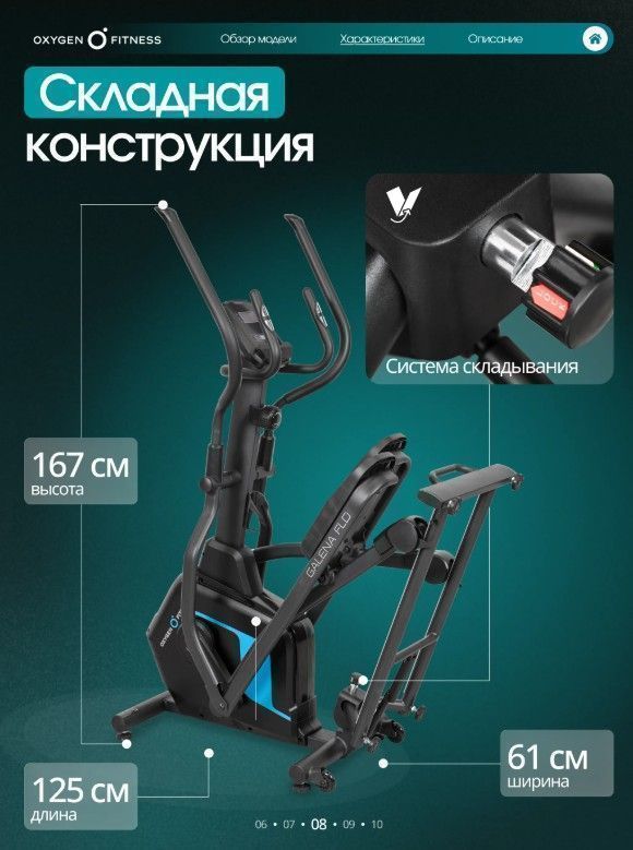 ОписаниеOXYGEN FITNESS GALENA FLD — компактный и функциональный эллиптический тренажёр для домашних тренировок, ориентированный на регулярные кардиозанятия с акцентом на комфорт, плавность хода и экономию пространства. Передний привод, складная конструкция и автономная работа делают модель удобным решением для квартиры, позволяя поддерживать физическую форму без сложной установки и подключения к электросети. Тренажёр построен на прочной конструкции с использованием ударопрочного полистирола HIPS, устойчивого к износу и механическим нагрузкам. Передний привод и инерционный вес маховика 24 кг (BioFusion™) при реальном весе 6 кг обеспечивают плавное и равномерное движение без рывков. Длина шага 460 мм подходит для большинства пользователей и создаёт комфортную амплитуду движения при ходьбе и умеренно интенсивных тренировках. Расстояние между педалями 80 мм способствует устойчивому положению ног, а трёхкомпонентный шатун повышает надёжность педального узла и срок службы тренажёра. Двухпозиционные нескользящие рукоятки с сенсорными датчиками пульса позволяют задействовать мышцы верхней части тела и контролировать частоту сердечных сокращений во время занятий. OXYGEN FITNESS GALENA FLD использует магнитную систему нагружения с 10 уровнями сопротивления, регулируемыми вручную. Такой тип нагрузки работает тихо, не требует обслуживания и идеально подходит для домашних условий. Тренажёр не нуждается в подключении к электросети, что упрощает его размещение в любом помещении. Консоль оснащена монохромным LED-дисплеем и отображает основные параметры тренировки: • время, • скорость, • дистанцию, • калории, • пульс, • общую дистанцию. Доступные режимы работы — быстрый старт и ручной режим. Интерфейс поддерживает русский и английский языки. Одно из ключевых преимуществ модели — складная конструкция, позволяющая существенно сократить занимаемое пространство после тренировки. В сложенном виде тренажёр сохраняет компактные габариты и удобен для хранения. Для повседневного комфорта предусмотрены: • транспортировочные ролики, • компенсаторы неровностей пола, • подставка под планшет или смартфон, • держатель для бутылки. OXYGEN FITNESS GALENA FLD — практичный эллиптический тренажёр для дома, сочетающий плавность хода, надёжную конструкцию и удобство хранения, идеально подходящий для регулярных кардиотренировок в ограниченном пространстве.