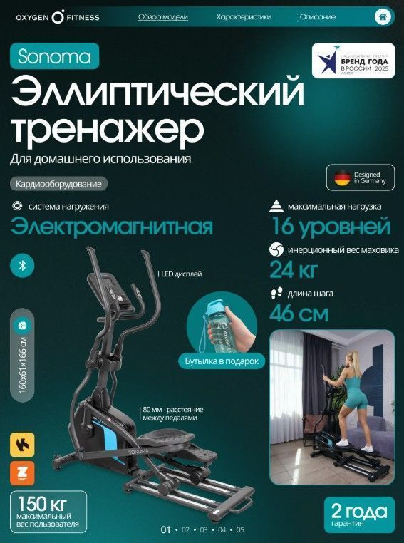 ОписаниеOXYGEN FITNESS SONOMA — современный эллиптический тренажёр для домашних кардиотренировок, сочетающий плавную биомеханику, электронную систему нагружения и расширенные цифровые возможности. Модель подойдёт для пользователей, которые хотят тренироваться регулярно, контролировать нагрузку и использовать интерактивные форматы занятий без перегрузки суставов. Тренажёр построен на высокопрочной раме с антикоррозийной обработкой и двухслойной покраской, что обеспечивает устойчивость и долговечность конструкции. Корпус выполнен из ударопрочного полистирола HIPS, устойчивого к механическим нагрузкам и износу. Ключевые параметры движения: • Инерционный вес маховика 24 кг (BioFusion™) при реальном весе 6 кг — ровный и стабильный ход без рывков. • Длина шага 460 мм — комфортная амплитуда движения для пользователей разного уровня подготовки. • Расстояние между педалями 80 мм — устойчивое и безопасное положение ног. • Трёхкомпонентный шатун — повышенная надёжность и ресурс педального узла. Увеличенные антискользящие педали обеспечивают уверенную фиксацию стопы, а двухпозиционные рукоятки позволяют задействовать мышцы верхней части тела. OXYGEN FITNESS SONOMA оснащён электромагнитной системой нагружения с 16 уровнями сопротивления, регулируемыми электронно. Это позволяет точно подбирать интенсивность тренировки и плавно менять нагрузку в процессе занятия. Цветная LED-консоль отображает расширенный набор тренировочных показателей: • время, скорость, дистанцию, • калории и пульс, • программу, Ватты, • жироанализатор и количество шагов. Программный пакет включает 20 режимов тренировок: • быстрый старт и ручной режим, • 10 предустановленных программ, • 4 пульсозависимые программы, • 4 пользовательские программы, • режим работы по Ваттам и жироанализатор. Для более точного контроля пульса предусмотрены сенсорные датчики на поручнях, а также возможность подключения Bluetooth-кардиодатчика (приобретается отдельно). Тренажёр поддерживает Bluetooth-подключение к популярным приложениям Kinomap™ и Zwift™ с интерактивным уровнем интеграции, что делает тренировки более вовлекающими и разнообразными. Дополнительные элементы комфорта: • подставка под планшет или смартфон, • подставка для бутылки, • удлинённый сетевой шнур 4 м, • транспортировочные ролики и компенсаторы неровностей пола. Интерфейс доступен на русском и английском языках. Тренажёр работает от сети 220 В и рассчитан на пользователей весом до 150 кг. OXYGEN FITNESS SONOMA — сбалансированный эллиптический тренажёр для дома, который объединяет комфортную биомеханику, современные технологии и функциональность, необходимую для эффективных и разнообразных кардиотренировок.