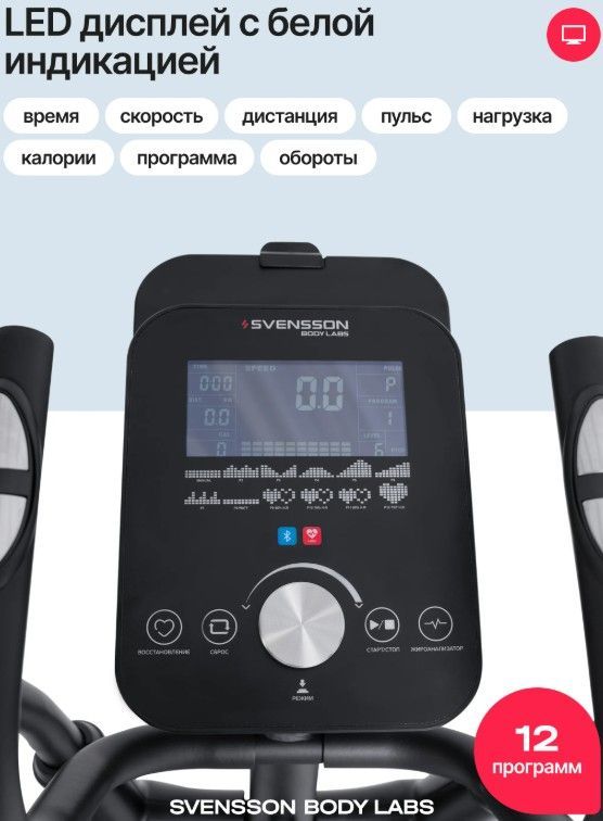 ОписаниеЭллиптический тренажер SVENSSON BODY LABS FORGE — это идеальный выбор для тех, кто хочет заниматься фитнесом дома. С весом 52 кг и высокопрочной рамой с антикоррозийной обработкой, этот тренажер обеспечивает устойчивость и долговечность. Он оснащен электромагнитной системой нагружения с 16 уровнями нагрузки, что позволяет вам адаптировать тренировки под свои физические возможности и цели. Тренажер предлагает инерционный вес маховика в 24 кг, что обеспечивает плавный и комфортный ход. Расстояние между педалями составляет всего 30 мм, что способствует естественному движению во время тренировки. Длина шага в 500 мм и антискользящие педали увеличенного размера гарантируют безопасные и эффективные занятия. Двухпозиционные нескользящие рукоятки с сенсорными датчиками пульса позволяют контролировать сердечный ритм во время тренировки. Интуитивно понятная консоль и разнообразие программ Консоль с LED-дисплеем белой индикации отображает время, скорость, дистанцию, пульс, уровень нагрузки, калории и обороты. С 12 программами тренировок, включая ручной режим, предустановленные и пульсозависимые, вы сможете разнообразить свои занятия. Возможность подключения к тренировочным мобильным приложениям (Kinomap™, Fitshow™) через Bluetooth добавляет элемент интерактивности и мотивации. SVENSSON BODY LABS FORGE сделает ваш домашний фитнес не только более доступным, но и эффективным! Ключевые преимущества XYGEN FITNESS NIOBI: • 16 уровней нагрузки для индивидуальной настройки тренировок, подходящие для пользователей до 150 кг; • сенсорные датчики на поручнях для точного измерения пульса и возможность сопряжения с кардиодатчиком Bluetooth; • транспортировочные ролики и компенсаторы неровностей пола для легкости перемещения и установки; • подставка для планшета/смартфона и держатель для бутылки для максимального удобства во время тренировок.