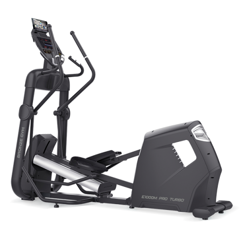 Большое внимание на E1000M уделено внешнему виду, из которого вытекают все биомеханические преимущества модели. Тренажер относится к классу эллиптических с маховиком, расположенным в задней части оборудования. Инерционный вес маховика E1000M эквивалентен 25 кг. Такой показатель обеспечивает непрерывные плавные движения на любых уровнях сопротивления (всего их 20). Стоит отметить, что команда инженеров-конструкторов Bronze Gym добились рекордной отметки в расстоянии между педалями. На E1000M PRO TURBO так называемый супермалый Q-Фактор составляет всего 2,7 см. Это один из самых лучших показателей в индустрии фитнеса, который повторяет максимально естественные движения пользователя во время тренировок. Что касается длины шага, то здесь она составляет оптимальные 50,8 см. Для более интенсивных тренировок и их разнообразия на тренажере установлен электрически изменяемый угол наклона (15 уровней).