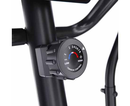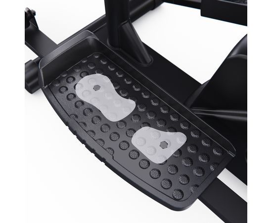 Тренажёр имеет максимальный вес пользователя 130 кг и длину шага 38 см. Механическая регулировка нагрузки предлагает 8 уровней сложности, а транспортировочные ролики и компенсаторы неровности пола обеспечивают стабильность и удобство использования.