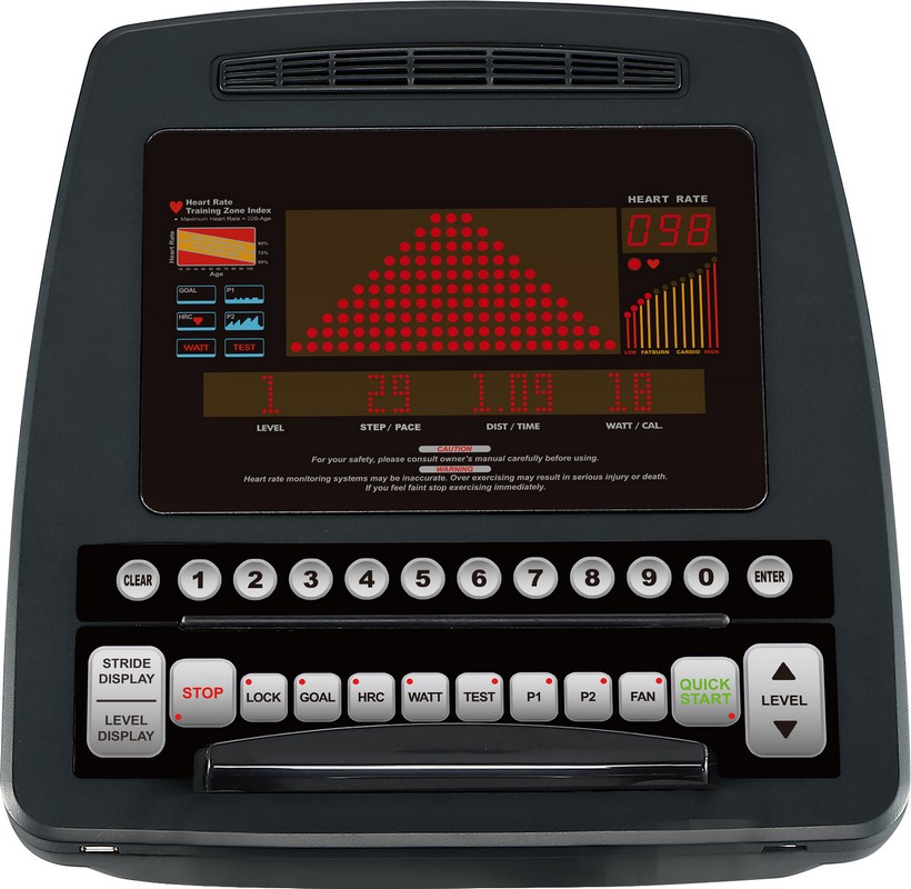 Профессиональный эллиптический тренажер премиум-класса с изменяемой длиной шага от 250 до 1000 мм. Оснащен контрастной и интуитивно понятной красной LED-матрица с диаграммой тренировки и пятью дополнительными LED-окошками для отображения показателей тренировки (уровень нагрузки, об/мин, скорость, расстояние, время, Ватты, калории).
