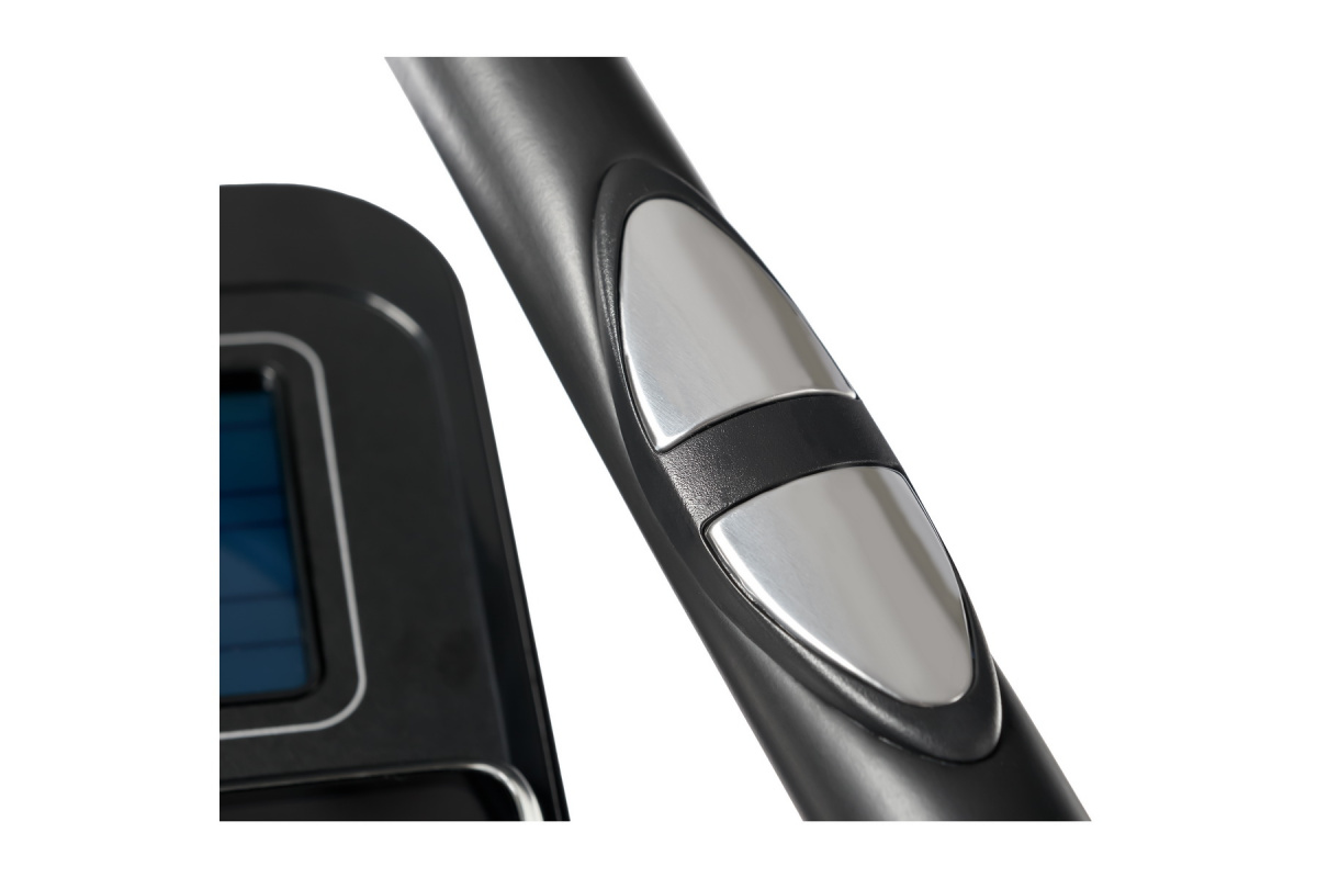 Тренировочный компьютер представлен черно-белым LCD-дисплеем диагональю 5 дюймов (12,7 см). На экран выводятся все основные параметры тренировки - время, дистанция, скорость, калории, обороты в мин. и пульс. Измерение пульса происходит путем удержания ладоней на сенсорных датчиках пульса, расположенных на поручнях. Нагрузка регулируется механическим путем в 8 положениях. К числу дополнительных характеристик эллипсоида относятся такие опции как транспортировочные ролики и компенсаторы неровностей пола. Переместить изделие из одного места в другое не составит большого труда, а компенсаторы позволят отрегулировать положение ножек на неровной поверхности.
