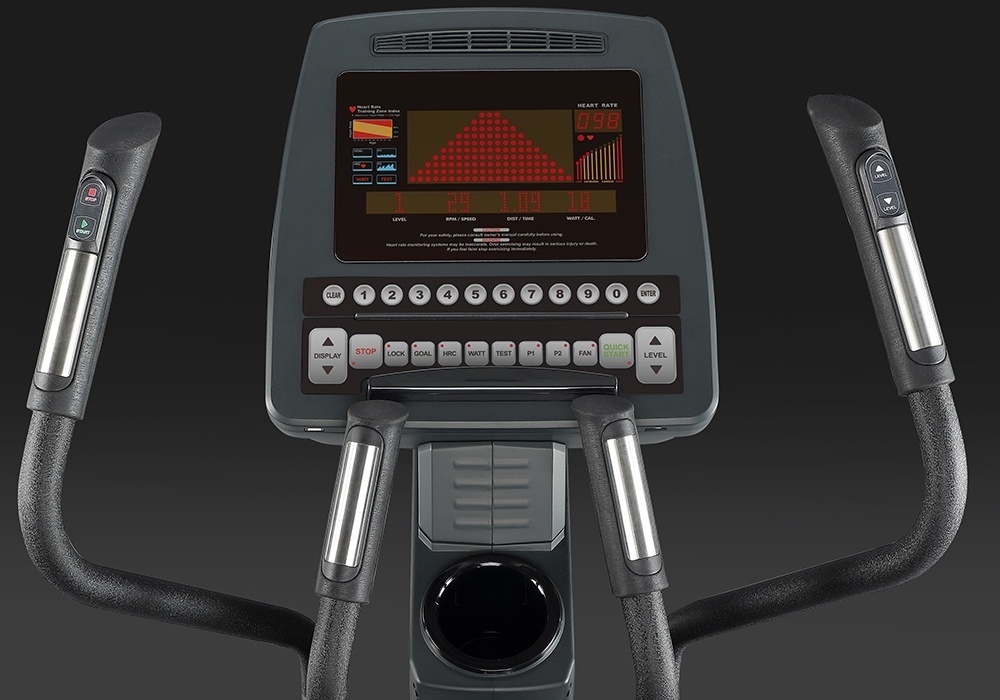 В центре консоли тренажера Vertex Alpha Swing расположен большой матричный LED дисплей с красной индикацией, который отображает всю информацию о состоянии тренажера и диаграмму текущей программы. Также на консоли есть пять вспомогательных дисплеев для отображения пульса, уровня нагрузки, об/мин, скорости, расстояния, времени, ватт и калорий. Удобные кнопки для быстрого доступа на консоли позволяют быстро изменить нагрузку, выбрать необходимую программу, переключить дисплеи показателей тренировки, управлять различными параметрами тренировки. Две большие клавиши по бокам консоли служат для приостановки программы и быстрого старта. Дополнительный функционал для удобства пользователя - встроенный вентилятор, USB зарядка для мобильных устройств, полочка для планшета и держатель бутылки.