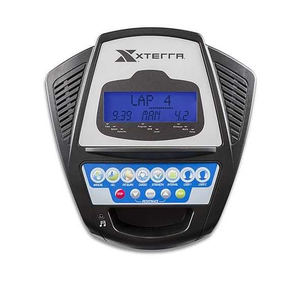 Комфорт Транспортировочные ролики да Camber Angle 2⁰ да Держатель для бутылки да Компенсаторы неровности пола да Встроенный вентилятор нет Комплект ключей для сборки да Силиконовая смазка да Компьютер Дисплей 5,5" LCD с голубой подсветкой Количество уровней сопротивления 1-20 Общее количество программ 9 (Manual, P1-P5, User 1-2) Пользовательские программы 2 Отображение расхода калорий да Отображение дистанции да Отображение времени тренировки да Отображение скорости да Отображение пульса да Отображение количество оборотов да Возможность программирования тренировки да Подключение MP3 да Качество Сертификат качества CE+GS Фирменная гарантия 2 года (1 год от производителя + 1 год* дополнительная) Габариты и вес Размеры в рабочем состоянии (см) (Д х Ш х В) 166 х 56 х 163 Размеры в упаковке (см) (Д х Ш х В) 148,5 х 57 х 78 Вес нетто (кг) 70,3 Вес брутто (кг) 81,5 Общие технические характеристики Наименование Эллиптический тренажер XTERRA FS 4.0e Производитель США Торговая марка Xterra Сборка Тайвань Измерение пульса датчики на рукоятках Использование домашнее Подключение к сети 220В (адаптер DC9v/1.5A) Система нагружения магнитная, MSR Механизм регулировки нагрузки электронный (ECB) Dual Drive да Длина шага (мм) 457 Уровень шума беcшумный Телеметрия нет Kinetic Energy да Вес маховика (кг) 10 Максимальный вес пользователя (кг) 150 Характеристики