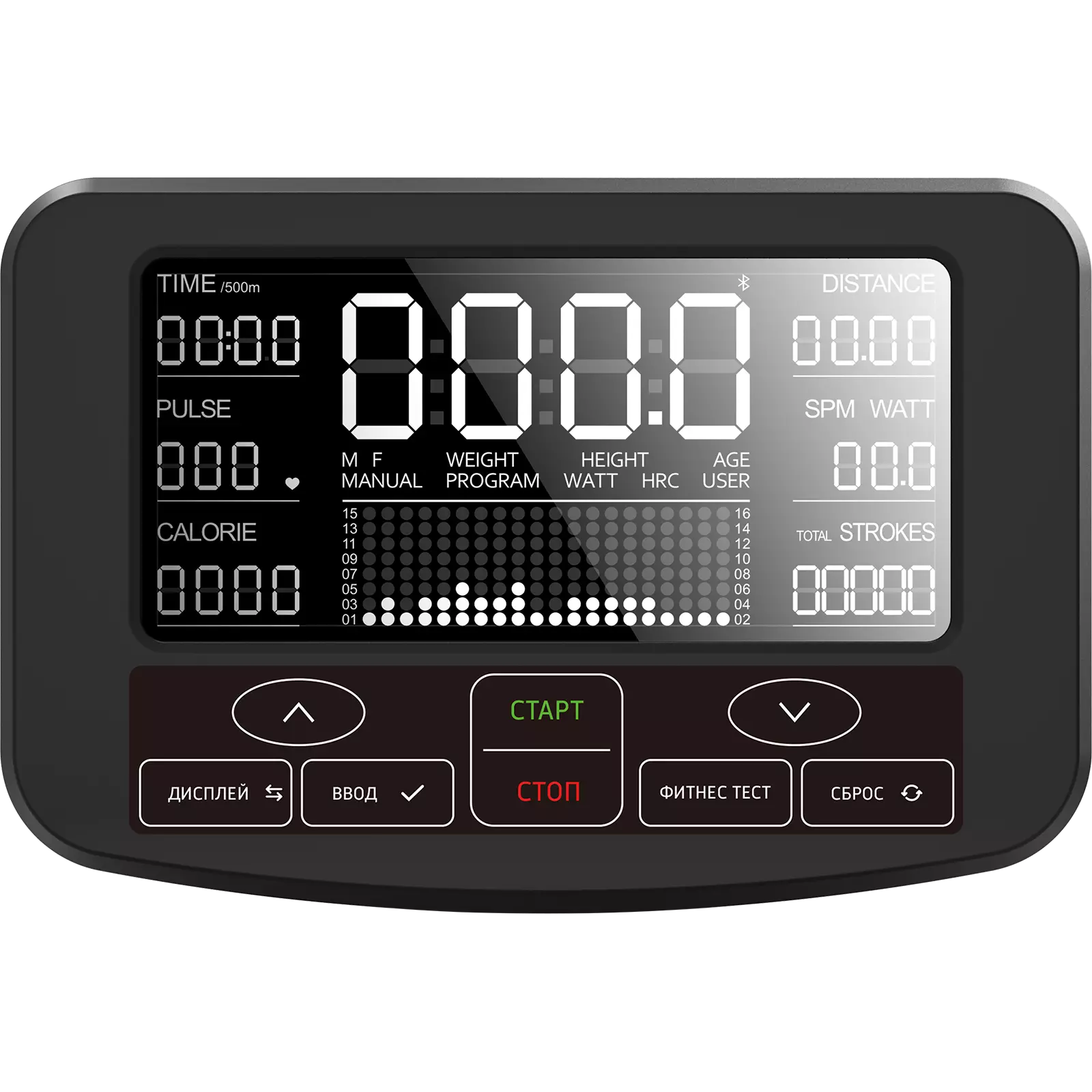 Компьютер управления с контрастным LCD дисплеем 5.4” и удобной клавиатурой включает оптимальный пакет программ. Встроенный HRC модуль позволяет использовать беспроводной датчик пульса 5 кГц. Яркое черно-белое изображение и крупный шрифт вывода параметров оптимальны для зрения, помогают концентрироваться непосредственно на тренировочном процессе. Простая навигация меню и удобные клавиши облегчают процесс настройки и управления тренировкой. Наличие встроенного Bluetooth модуля позволят Вам использовать приложения Kinomap и Fitshow (IOS и Android).