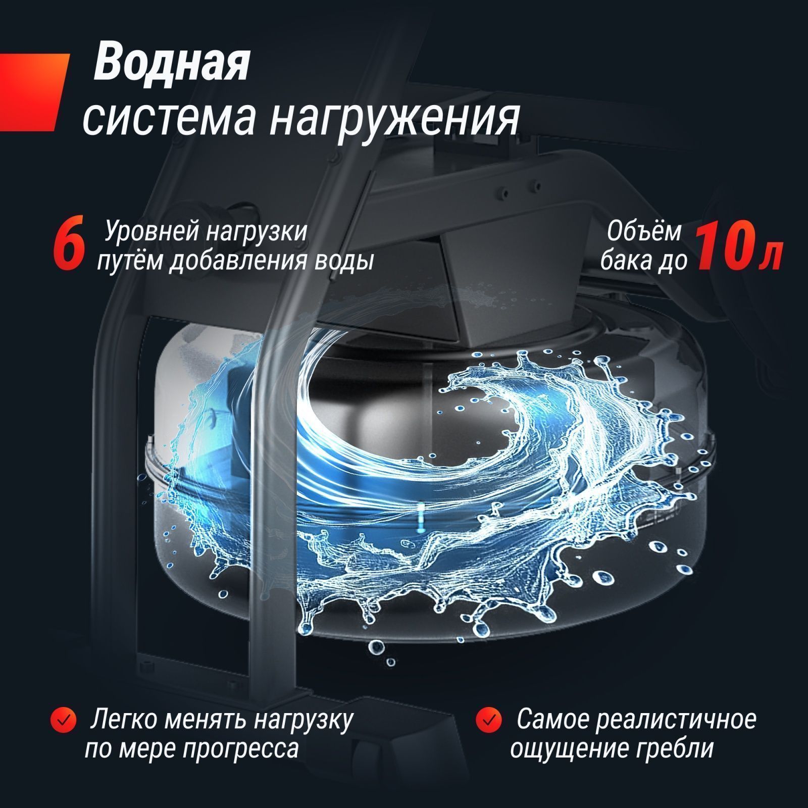 Тренажер построен на прочном каркасе из стали и способен выдержать вес пользователя до 130 кг. Данная конструкция гарантирует стабильность и безопасность во время самых интенсивных тренировок. Благодаря водному сопротивлению создается ощущение настоящей гребли по воде, а увеличивая объем воды в цилиндре можно индивидуально подбирать нагрузку, выбирая из 6 уровней сложности. Прозрачный бак на 10 литров выполнен из пластика, что дает возможность видеть уровень воды, а также создает приятное визуальное ощущение во время занятий, успокаивая нервную систему.