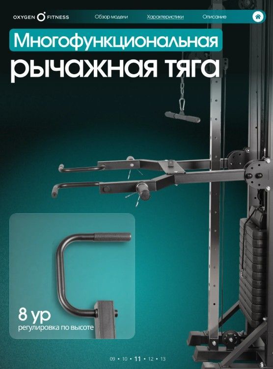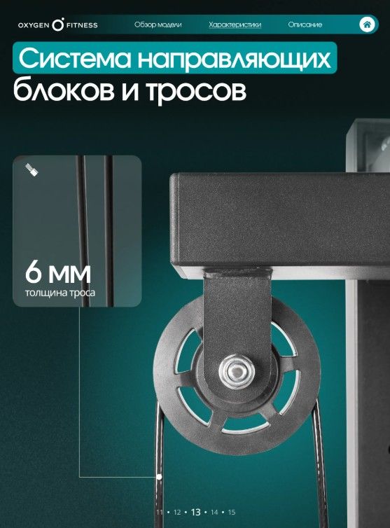 ОписаниеOXYGEN FITNESS VESTON - это мощный полукоммерческий кроссовер с полным функционалом для развития мышц верхней части тела, корпуса и рук. Тренажёр оснащён двумя независимыми грузоблоками и множеством дополнительных станций, что делает его универсальным решением для небольших залов, студий, фитнес-клубов и продвинутых домашних тренировочных зон. Конструкция рассчитана на интенсивное использование и высокие нагрузки: максимальный вес пользователя - 220 кг, максимальная нагрузка - 140 кг. Основа тренажёра — жёсткая рама прямоугольного профиля 70×50 мм с толщиной стенки 1,5 мм, обеспечивающая идеальную устойчивость и долговечность. В комплексе используются два грузоблока по 70 кг каждый (12+12 плит), выполненные из прочной композитной плиты. Вес одной плиты — 5,7 кг. Передача нагрузки осуществляется через стальные тросы диаметром 6 мм — надёжные, износостойкие и рассчитанные на долгий срок службы. Габариты в рабочем положении: • 130 × 295 × 230 см. Вес нетто — 244 кг. VESTON предлагает широкий диапазон тренировок за счёт продуманной конструкции и прикладных аксессуаров: • Кроссовер с регулируемыми рычагами (8 уровней по высоте) — упражнения на грудные, плечи, спину, руки и корпус. • Многофункциональный турник — подтягивания разными хватами, тренировка спины и мышц кора. • Брусья с регулировкой по высоте (15 уровней) — проработка трицепса, грудных и стабилизаторов. • Многофункциональная рычажная тяга — вариативная работа на широчайшие и мышцы спины. • Канат для трицепса — точечная изоляция рук. Дополнительно предусмотрены: • 2 пружинных замка, • накопители под диски Ø50 мм для удобной организации пространства.