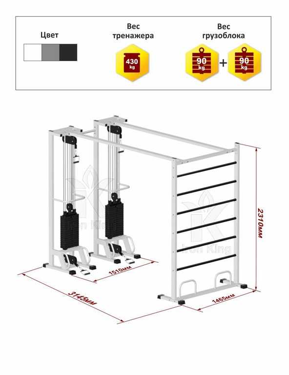 Цвет На выбор: белый, серый или черный Вес, не более 430 кг Вес грузоблока 95 кг*2 Вес одного груза 6 кг Трос 6мм в оболочке ПВХ Ход троса 1,84 Максимальная нагрузка троса 1 200 кг Покрытие грузоблоков Обрезиненные Втулка Пластиковая Подпятники Резиновые Краска Порошковая Размер 3145х1510х2310 мм Характеристики