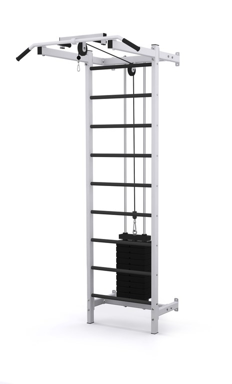 Шведская стенка повышенной прочности с перекладинами из ПВХ против скольжения. Грузоблок весом 50 кг подходит для поддержания физической формы в любом возрасте. Подходит для домашней и восстановительной физкультуры и проработки различных групп мышц.