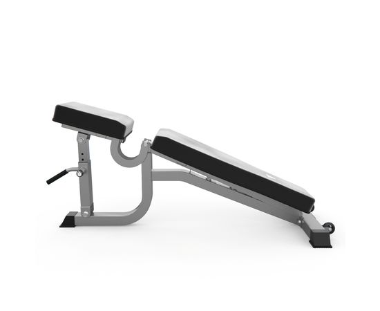 Спинку можно зафиксировать в 6-ти положениях — от 90 до 180 градусов. Фиксируется она при помощи упора на обратной стороне. Поменять положение легко, приподняв спинку и установив упор в нужном месте. Сиденье фиксируется в 5-ти положениях - от 158 до 180°. Благодаря конструкции с узкими передними ножками, упражнения наподобие жима гантелей выполнять ещё удобнее.